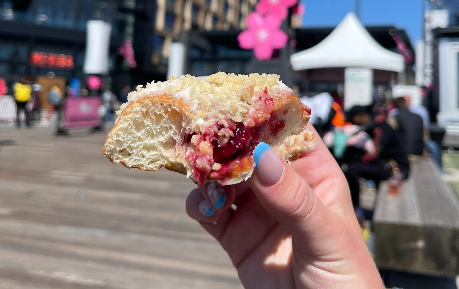 Undeterred by my stained pants and increasingly full stomach, I headed to the Wharf’s latest addition, E-Tea. I am a sucker for boba — for the uninitiated, that’s Tawainese milk tea with tapioca balls — so I’ve tried some of their drinks since opening in early March. This was my first time trying the cherry blossom milk tea, however, and the line out the door showed that everyone else was excited to try it too. The biggest takeaway is that it tasted almost exactly like strawberry Nesquik. It was delightful and pretty, but a bit too sweet to drink while munching on the now multiple doughnuts I had acquired. (Full disclosure, the drink’s sweetness may also be on me, since I didn’t adjust the sweetness level when the cashier asked, as is typical in boba shops. I’d also recommend skipping the whipped cream topping for a more balanced version.).