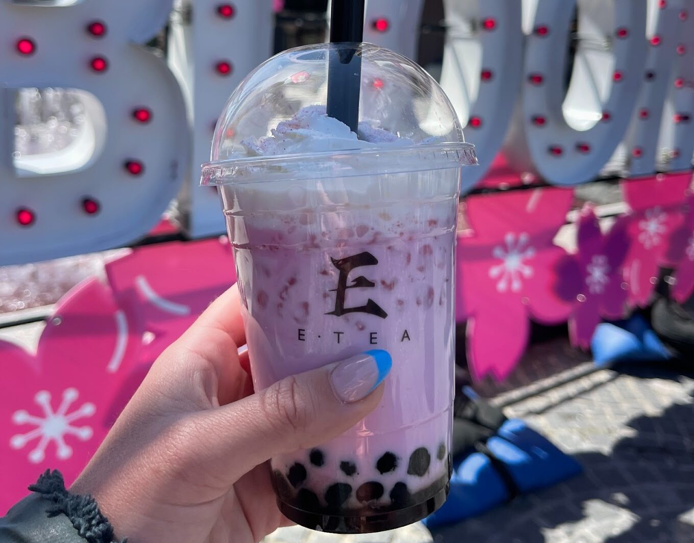 E-Tea’s cherry blossom milk tea ($6.50 with bubbles, 🌸🌸🌸 three blossoms)