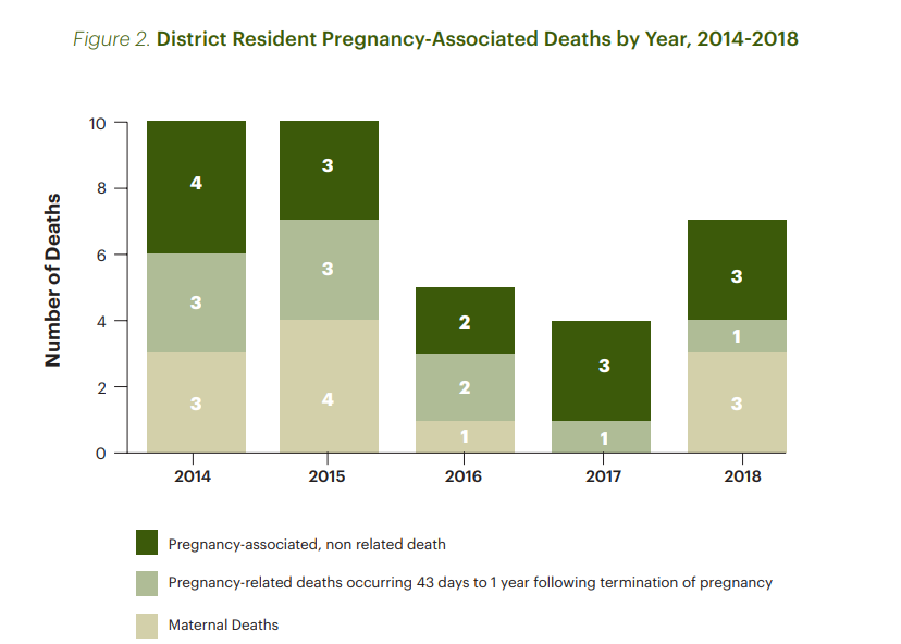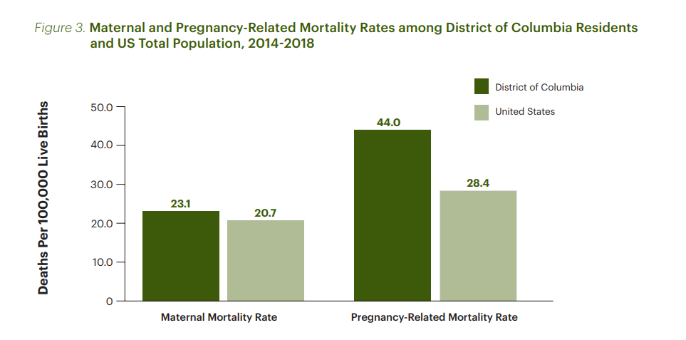 D.C.’s pregnancy-related mortality rate was nearly 44 deaths per 100,000 live births, compared to the national rate of 28 over the same period. Unlike maternal death, a pregnancy-related death refers to any death within one year of pregnancy from a pregnancy complication, a chain of events initiated by pregnancy, or the aggravation of an unrelated condition by the physiological effects of pregnancy.