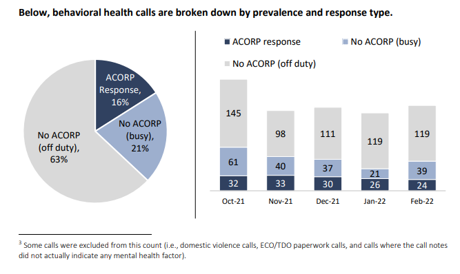 “Not only are there behavioral health calls for service that are not receiving an ACORP response, but the ACORP team is limited in terms of the ability to take time off as needed for individual well-being and program sustainability,” the report says.