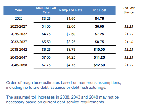 If the financing plan is approved, the Metropolitan Washington Airports Authority would raise tolls by $1.25 every five years except in 2033. That year, the tolls would increase by $1.50.