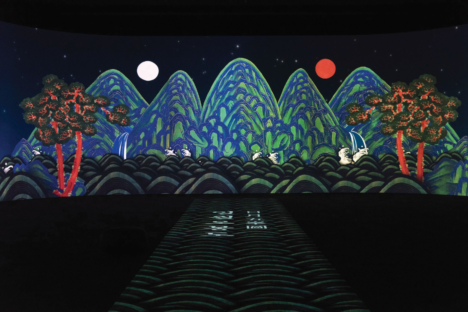 The exhibit offers some background into traditional Korean art as well. The National Museum of Korea opened multiple galleries dedicated to immersive digital art in 2020 to bring classic Korean paintings to life, and two of these installations are featured in this exhibit. “Climbing Mt. Geumgang” by Jeon Seon and “Royal Procession with the People”— based on a series of visual records from the Joseon Dynasty — are some of the best known paintings in Korea, but largely unfamiliar to Western audiences. Another piece by the group EASYWITH similarly blows ups and dramatizes classic Korean landscape paintings, letting them be considered in new ways.