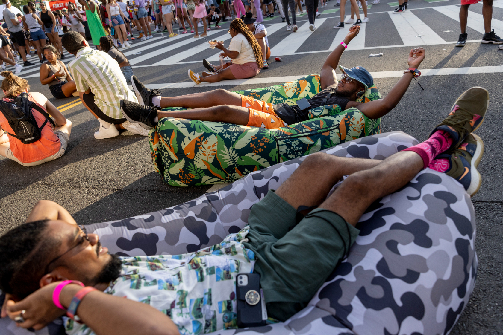 Still others enjoyed the festivities. On Friday, Ibrahim Hydara and Rasheed Billy lounged on inflatable couches in the middle of the street as they waited for performances.