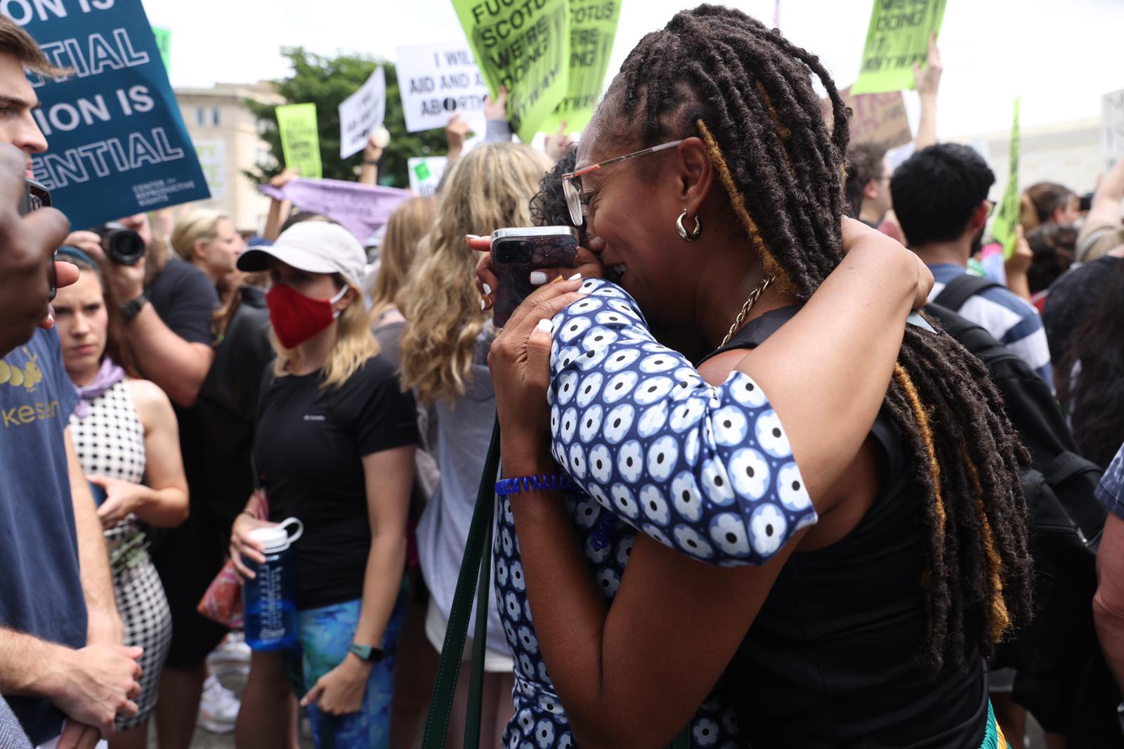 As anti-abortion demonstrators celebrated the ruling on Friday morning with loud music and cheer, pro-abortion activists feet away embraced one another in tearful hugs. Some shared information on abortion funds, which provide money to cover the cost of a procedure, or logsitics like transportation and childcare. After weeks of refreshing online blogs and social media feeds, waiting for what felt like an inevitable ruling, the gathering served as part protest, part catharsis for some.