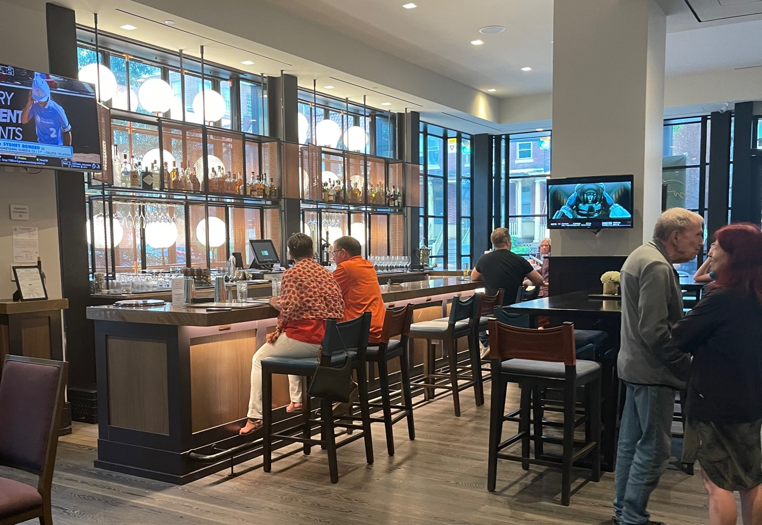 People entering the hotel’s doors are immediately confronted with to the bar, which has minimalist décor featuring neutral tones and a display of wine bottles — and yet serves as a buzzy center of activity within the restaurant.