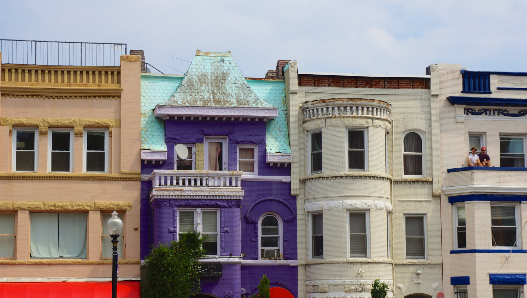 A 20-somethings man and woman walking towards 18th Street in Adams Morgan on a bright Saturday.