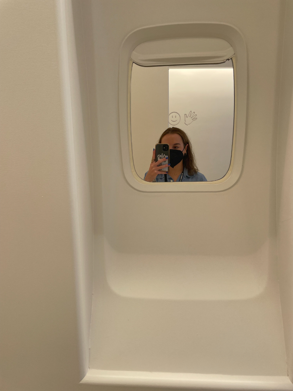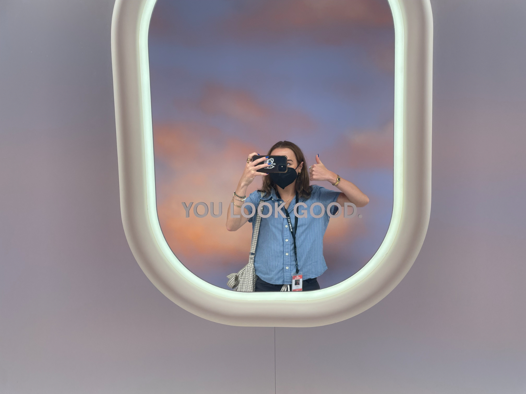 10:58: The editors have dispersed to different parts of the building, iPads in hand. I realize I haven’t looked at the selfie room yet, and should check it out before the space gets too crowded. It’s a small space, hidden behind the wall that holds the flip-board. There’s a giant mirror (also fashioned to look like a plane window) that reads “YOU LOOK GOOD.” I try tugging on the shade, but it doesn’t close. Just decorative.
