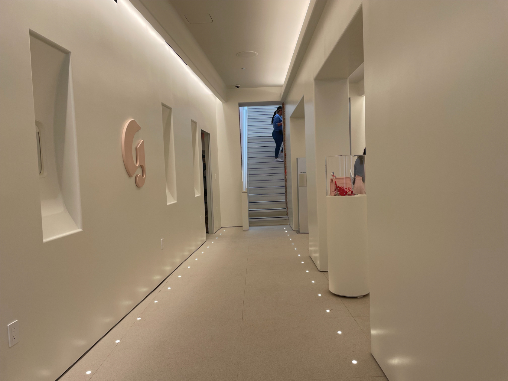 10:40: I’m in front of the store and there is certainly a Mass Of People. A large line, larger than I’d expected at 10:40 on a Friday, has unfurled down M Street. I approach two women in light-blue shirts with the signature Glossier “G” screenprinted on the chest and introduce myself. I tell them I’m a reporter, who was told to come early to take pictures of the space before anyone goes in. One of them opens the door, and lets me in.
