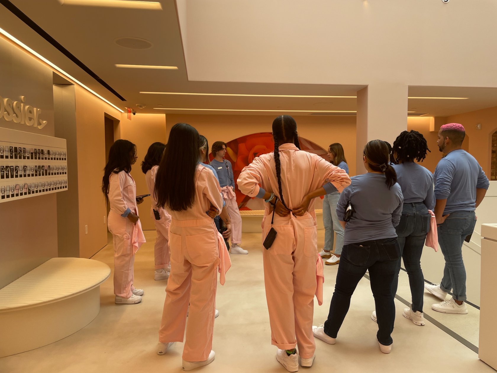 10:42: I introduce myself to one of the jump-suited women, whose title had “influencer” in it somewhere. She told me the “editors,” or sales associates, were about to have their pre-opening huddle and suggested this would be a great “content moment.” (As the visit wore on, I concluded GlossiAIR is meant to be more of a content moment than a retail store.) At Glossier, editors are “more than a sales person,” per a job listing online, responsible for maximizing the shoppers’ offline experience.