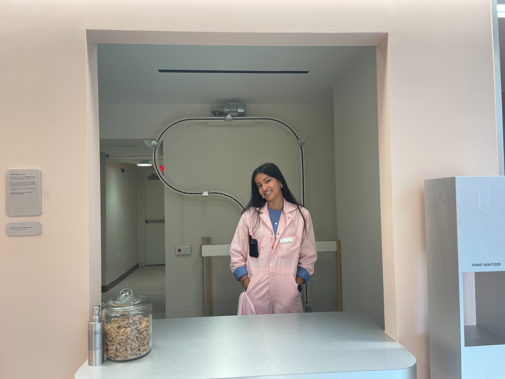11:10: Unlike in a Sephora or Ulta, Glossier stores don’t shelve products. That’s what the editors and iPads are for. Once a customer decides what they want, they place their order with the editor, who punches it into an iPad. The customer then heads over to the pick-up window to claim the goods. I walk out of the product room and towards the pick-up window, where I talk to Reeya, an editor standing behind a counter. I ask about the conveyer-belt like contraption behind her, and she tells me that it picks up the orders from the warehouse in the basement and carries them to the second floor. She then delivers them to the appropriate customer.