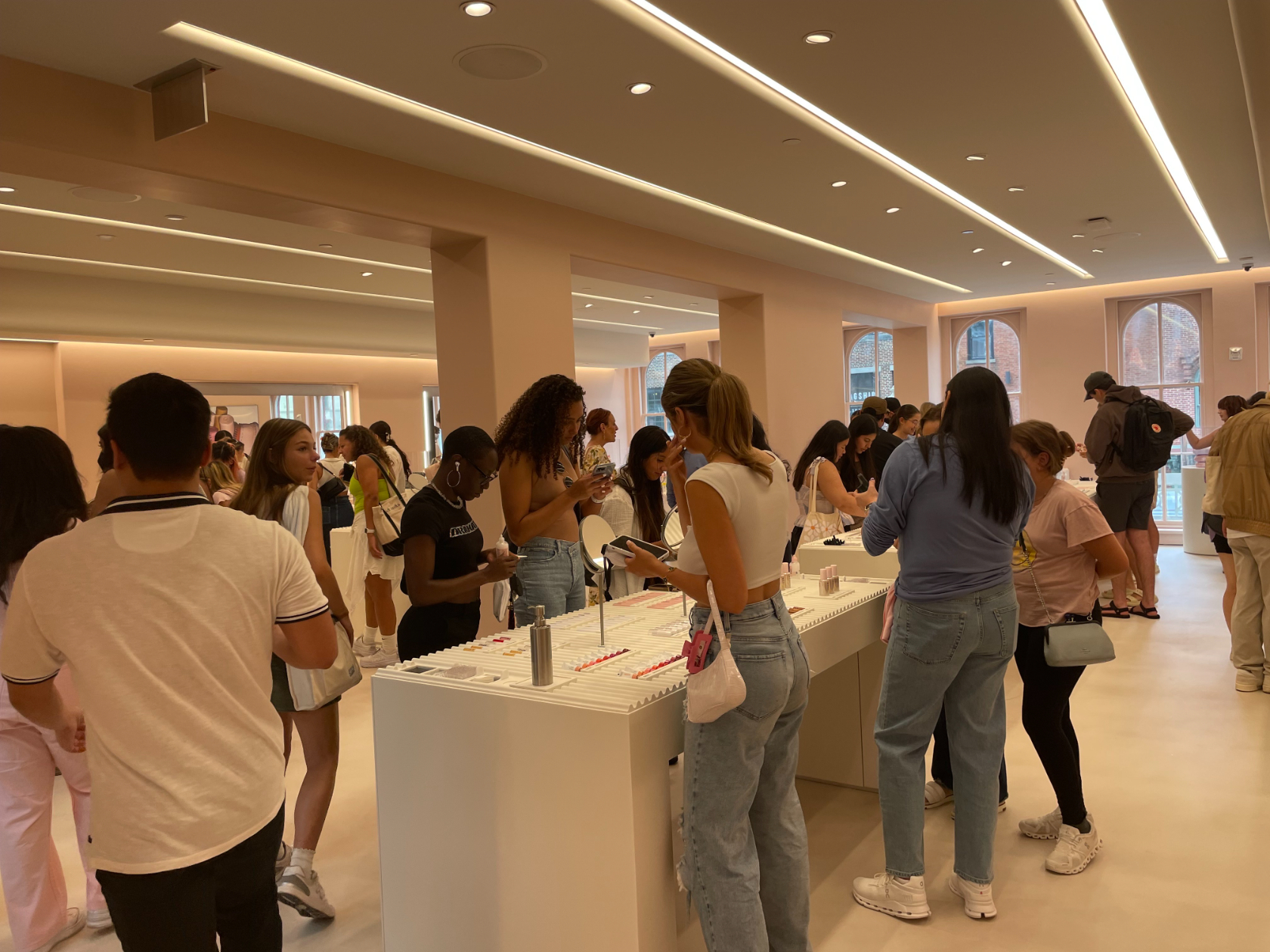 11:05: I walk about the product area as people swab and dab and pat products onto their hands, or lean over the counters to review a product in the mirror. The space became very crowded very quickly. The editors downstairs are managing a line, letting folks up in batches to avoid anything becoming too crammed. I’d be remiss if I did not mention that most shoppers coming up the steps (at least those unmasked) have flawless, Glossier-esque skin. I am thankful for my mask hiding the massive, truly monstrous chin zit I’ve been digging at for the past week.