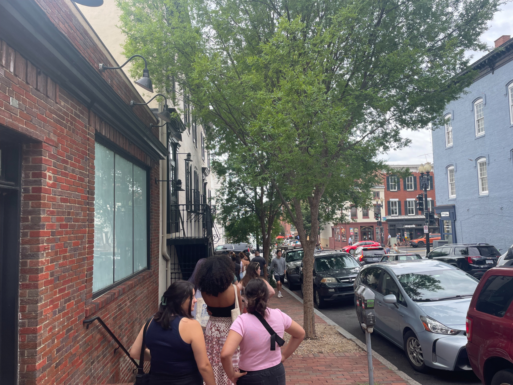 11:20: I’m milling around the product room again, looking at a moisturizer I sort of want to buy but definitely don’t need to buy. The space is filled with a dull roar of very kind “excuse me’s” as people try to get editors’ attention to place orders, or bypass other shoppers to grab a product. I glance out the window again, there’s a group of older adults — standing, ironically enough, in front of another skincare giant LUSH — looking in the direction of Glossier with a puzzled look, asking themselves, I imagine, the perennial question in D.C.: “What is everyone waiting in line for?”