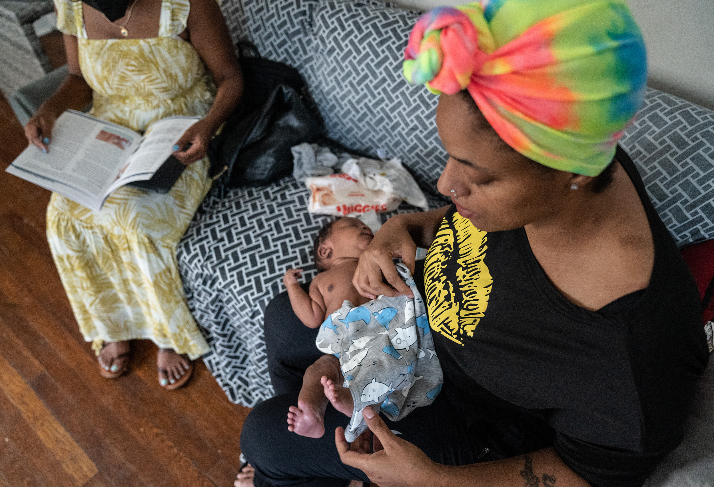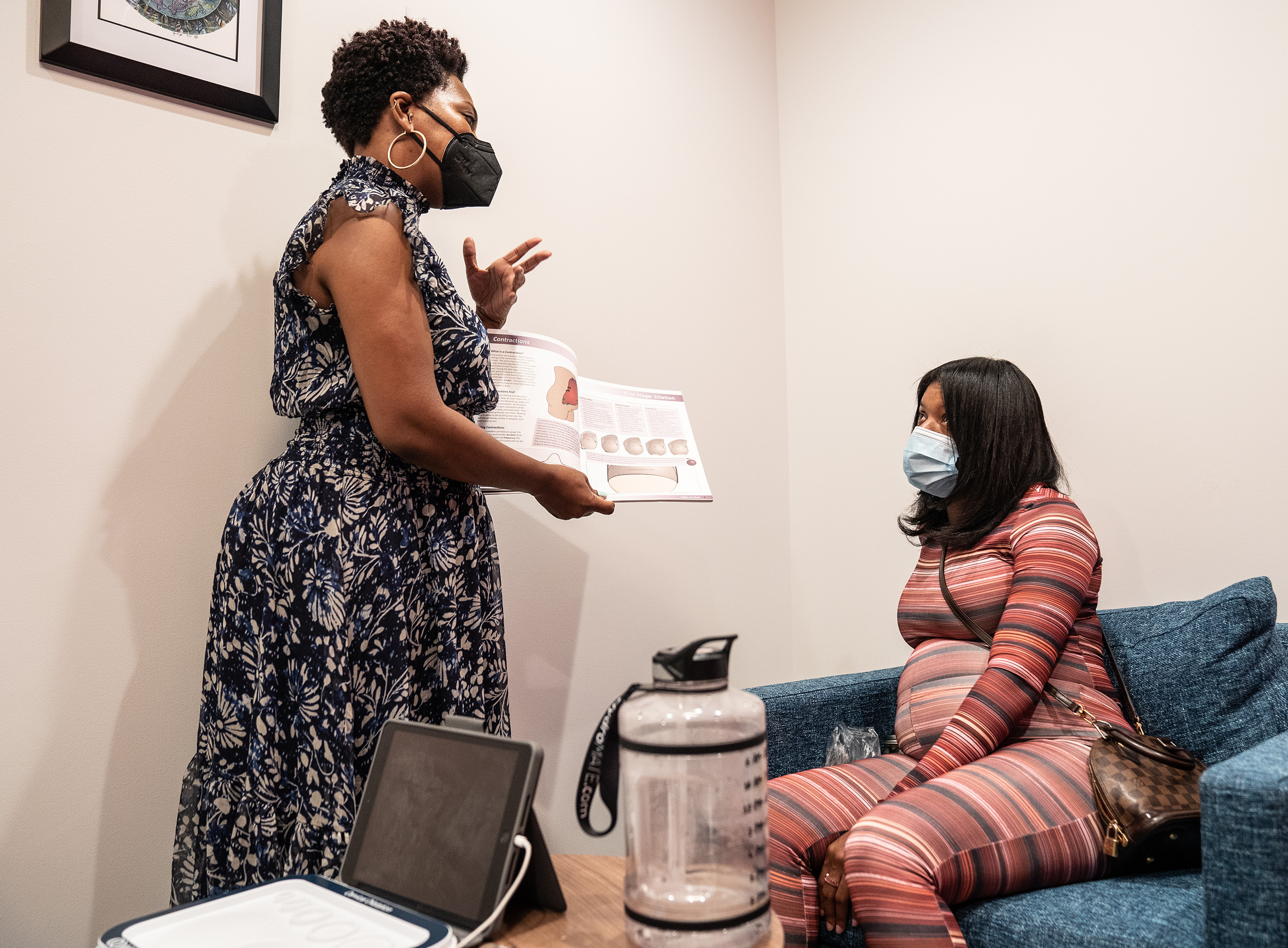 The women take her blood pressure, measure her belly, and check on her overall well-being. One of them balances an iPhone so that Makonnen’s partner can join the appointment remotely. They talk about how to prepare for an at-home birth, discuss a recommendation for a culturally competent pediatrician, suggest some exercises to help adjust the position of the fetus for an easier birth, and go over Makonnen’s overall nutrition and wellness. They also laugh and joke: the group dissolves into laughter when Makonnen, who usually eats vegetarian, admits she’s been craving ribs.