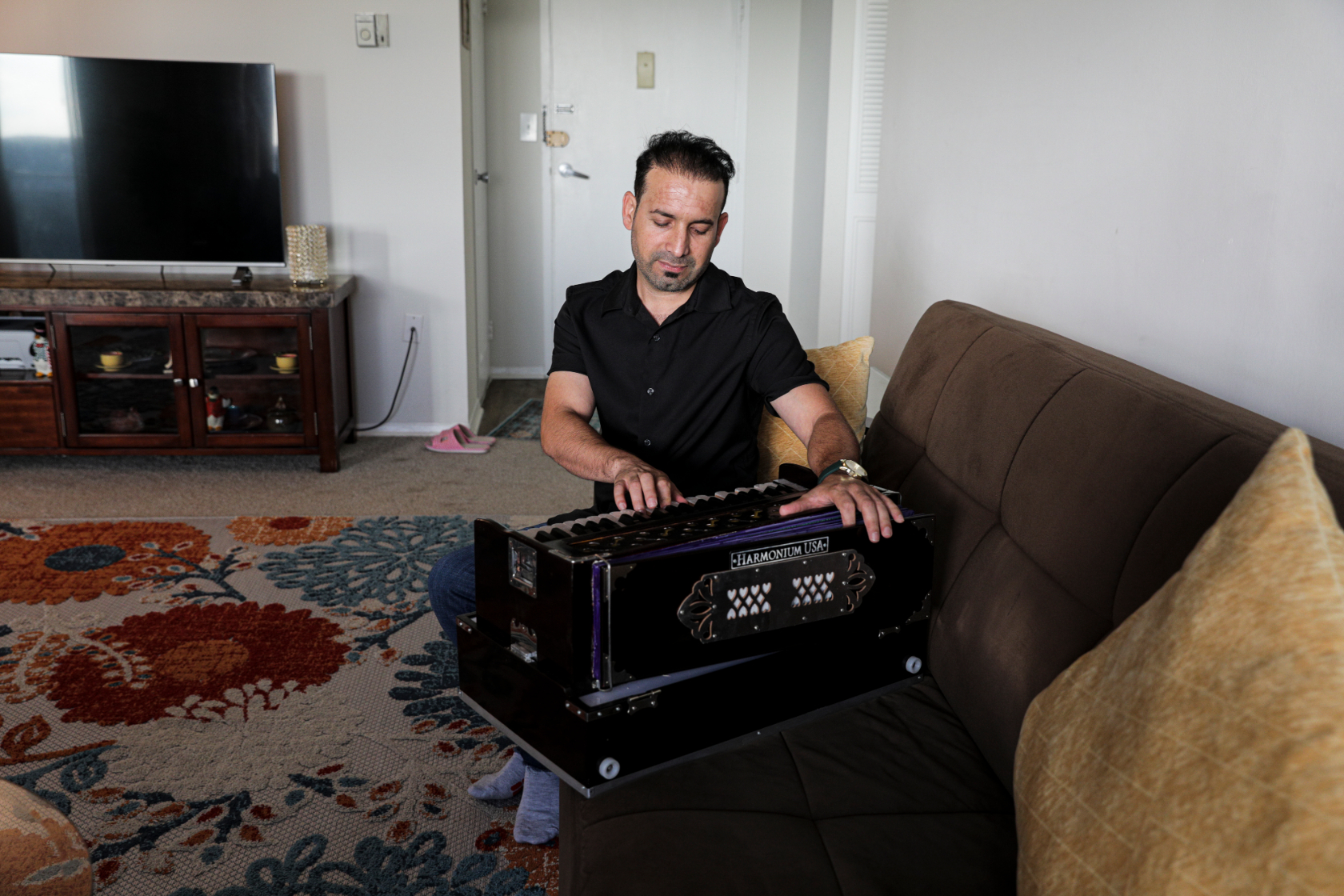 Masoud Hamnava’s singing career started when he was selected from out of a thousand other contestants for one of the 12 coveted spots on the 2009-2010 season of the reality television show Afghan Star. He was the youngest contestant. He went on to win third place before he was selected to compete on another popular show called Super Star. Soon, he was performing in concerts broadcast on televisions around the world. He also founded a media company in Afghanistan, Kabul Media Group, that specialized in historical documentaries and employed 11 young men and women. His singing career often drew threats from the Taliban, via letters and phone calls. He was able to evacuate with his sister a few days after Kabul fell. A few months ago, his parents sent him photos of his instruments which Taliban fighters had destroyed while conducting house searches. One fighter used a rifle to tear down a poster of Hamnava performing at a concert. Since coming to Virginia, he’s been able to sing at different Afghan events, including the One Journey refugee festival at the Kennedy Center. He’s also found IT work at a data center.