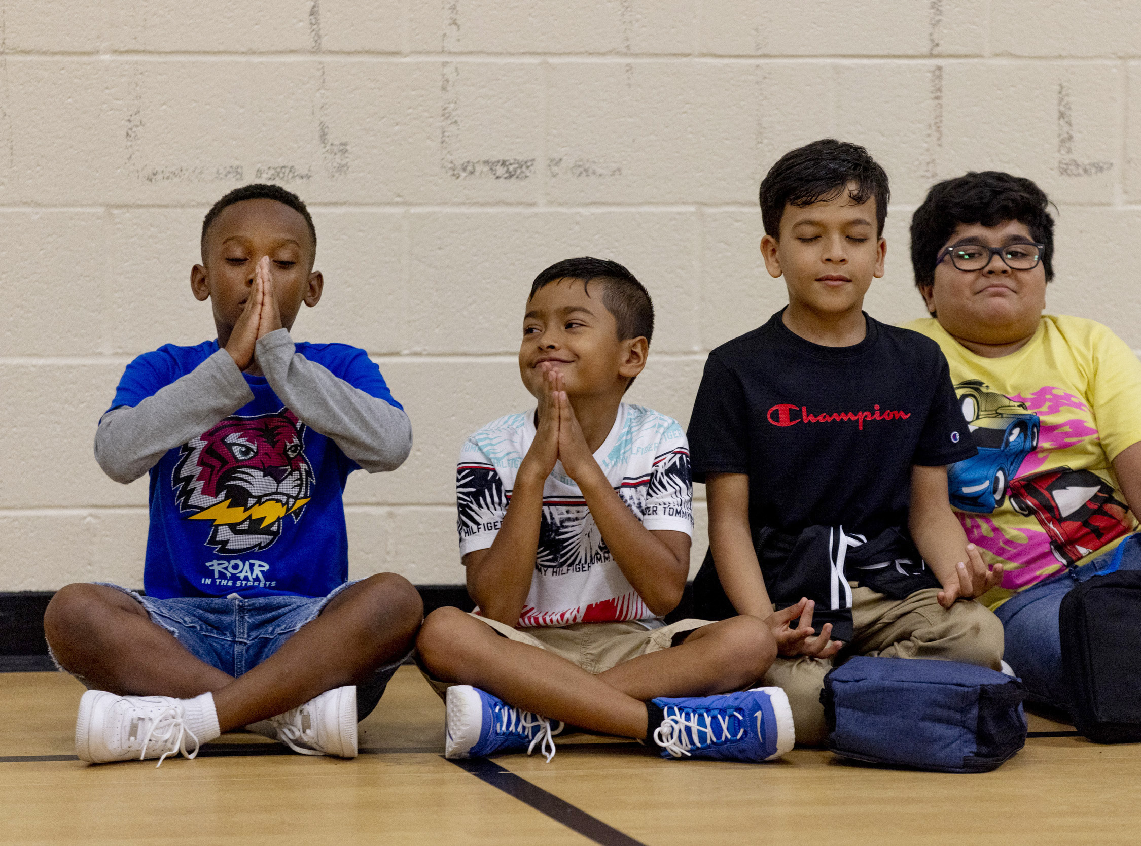 When the chime goes off, the kids wriggle a bit, and when Brod leads them in an inhale and an exhale, some of them make funny mouth noises. But the moment largely seems to land.