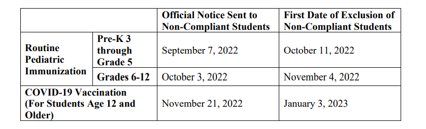 “To reduce the number of students who could be excluded from school at any one time, and to align schools and LEAs [local education agencies] to one unified notification and exclusion timeline, we are implementing staggered enforcement based on grade band,” Kihn wrote to school leaders on Friday. “We have heard from many of you about the challenges of tracking enforcement for COVID-19 vaccinations … We hope that the January 3, 2023 date for first exclusions of non-compliant students will give schools and LEAs additional time to prepare and for students to get their COVID-19 vaccinations.”