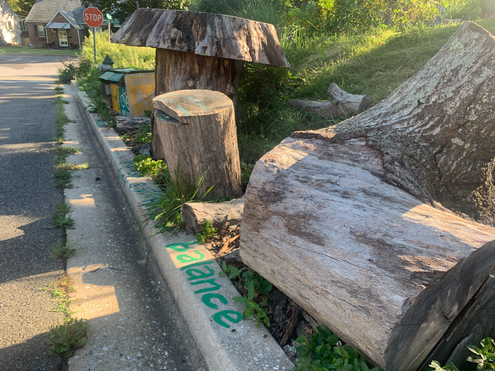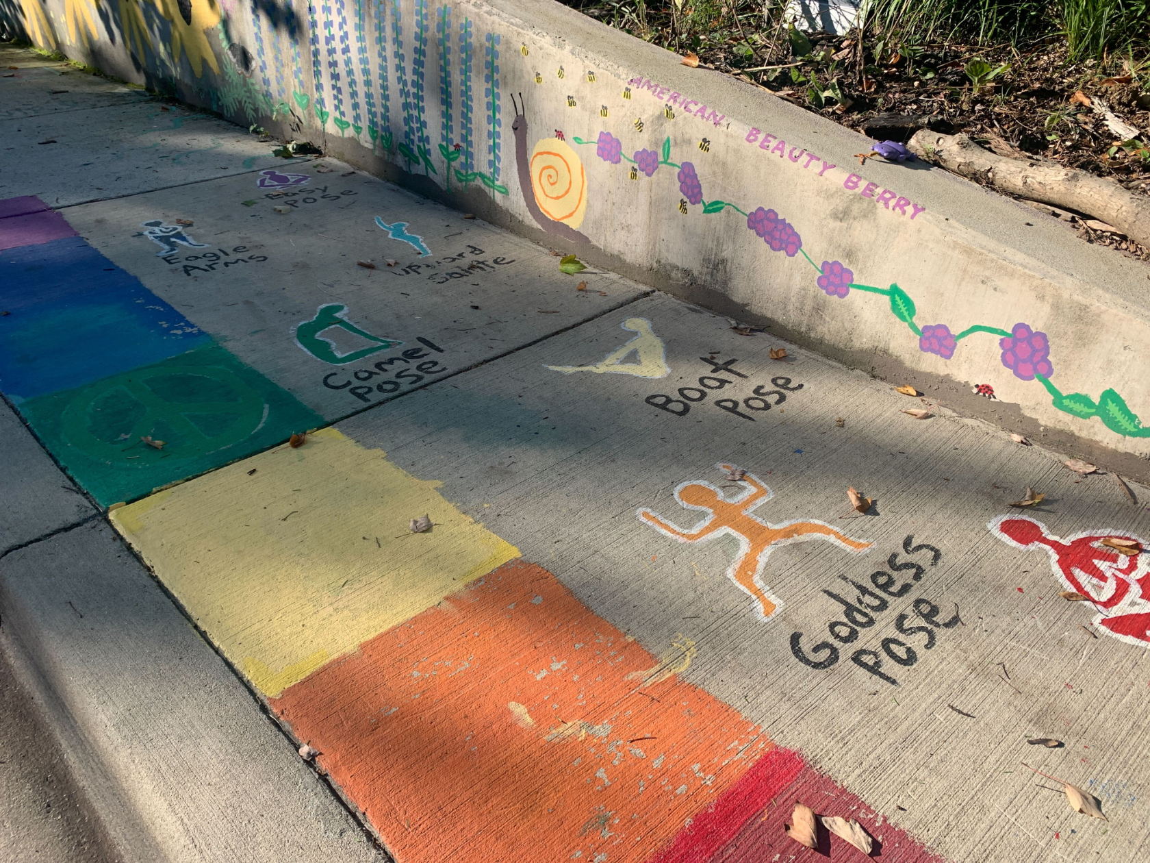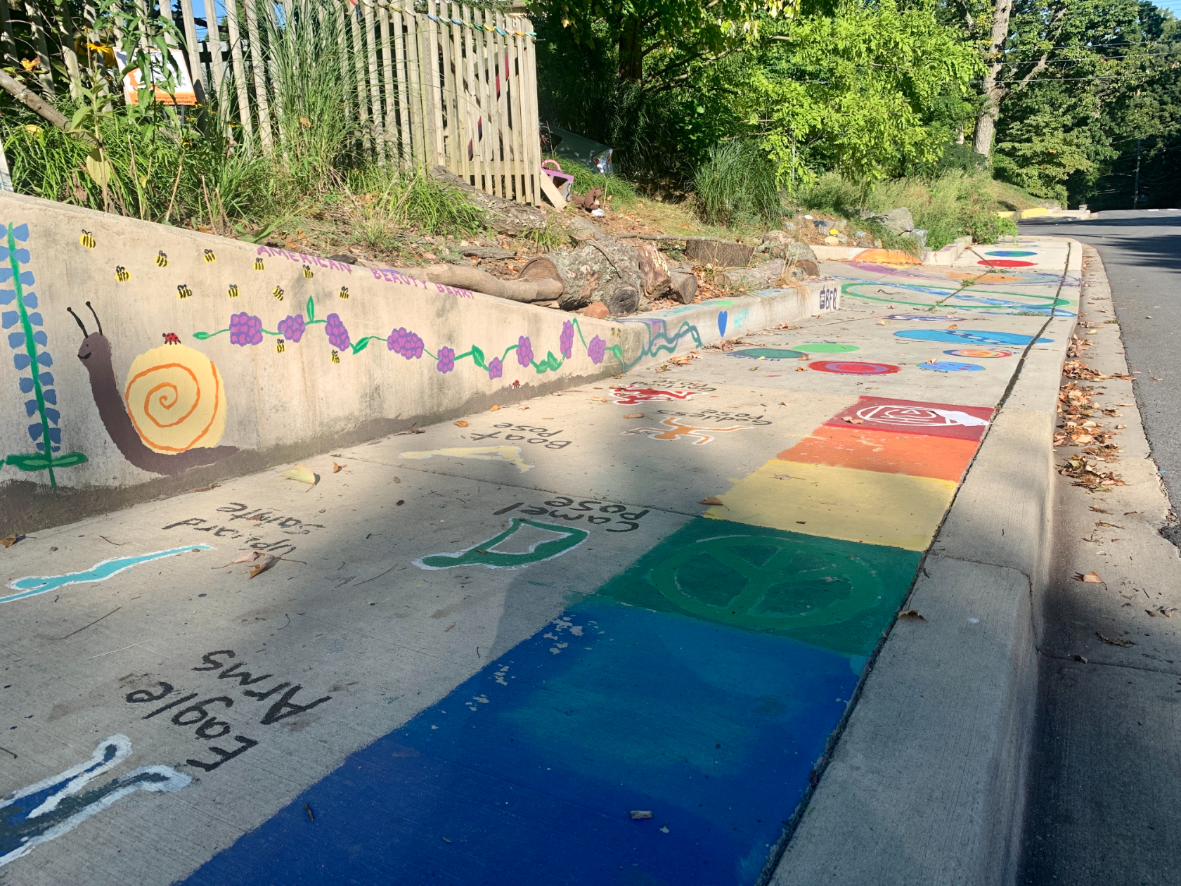 The bright and multi-colored mural, painted by local youth, features paintings of native plants and a kid-friendly obstacle course along a sidewalk and cement wall that spans two properties on Lincoln Avenue and around the corner to Aspen Ave. Comfort lives on the corner property, and part of the obstacle course includes rocks and tree stumps in her yard. Some of the sidewalk paint has faded away, but much of it remains.