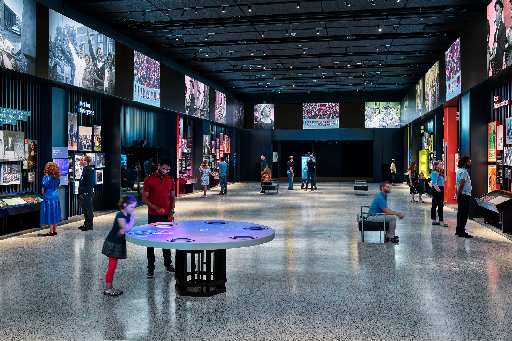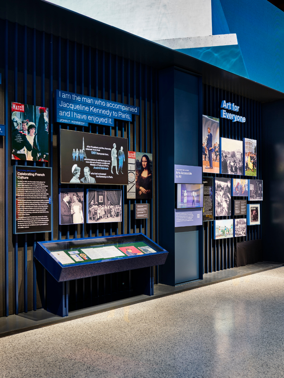 The room is tied together with a wraparound frieze video screen that runs across the top of the walls and displays explanatory signage, quotes, and panoramic videos. The showstopper is the periodic “takeovers” of the frieze screen. At intervals, the gallery lights dim, and video or photo collages accompany voiceovers of some of Kennedy’s most famous remarks, creating a mini immersive experience that stops the audience in their tracks.