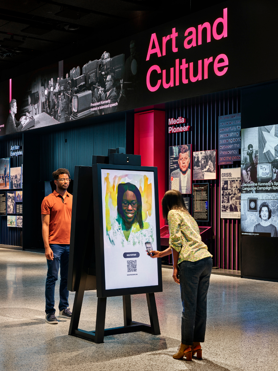 In another section, visitors can snap a selfie in front of a full-length display camera and digitally paint over it in the colorful, loose style of Elaine de Kooning’s famous portrait of JFK.