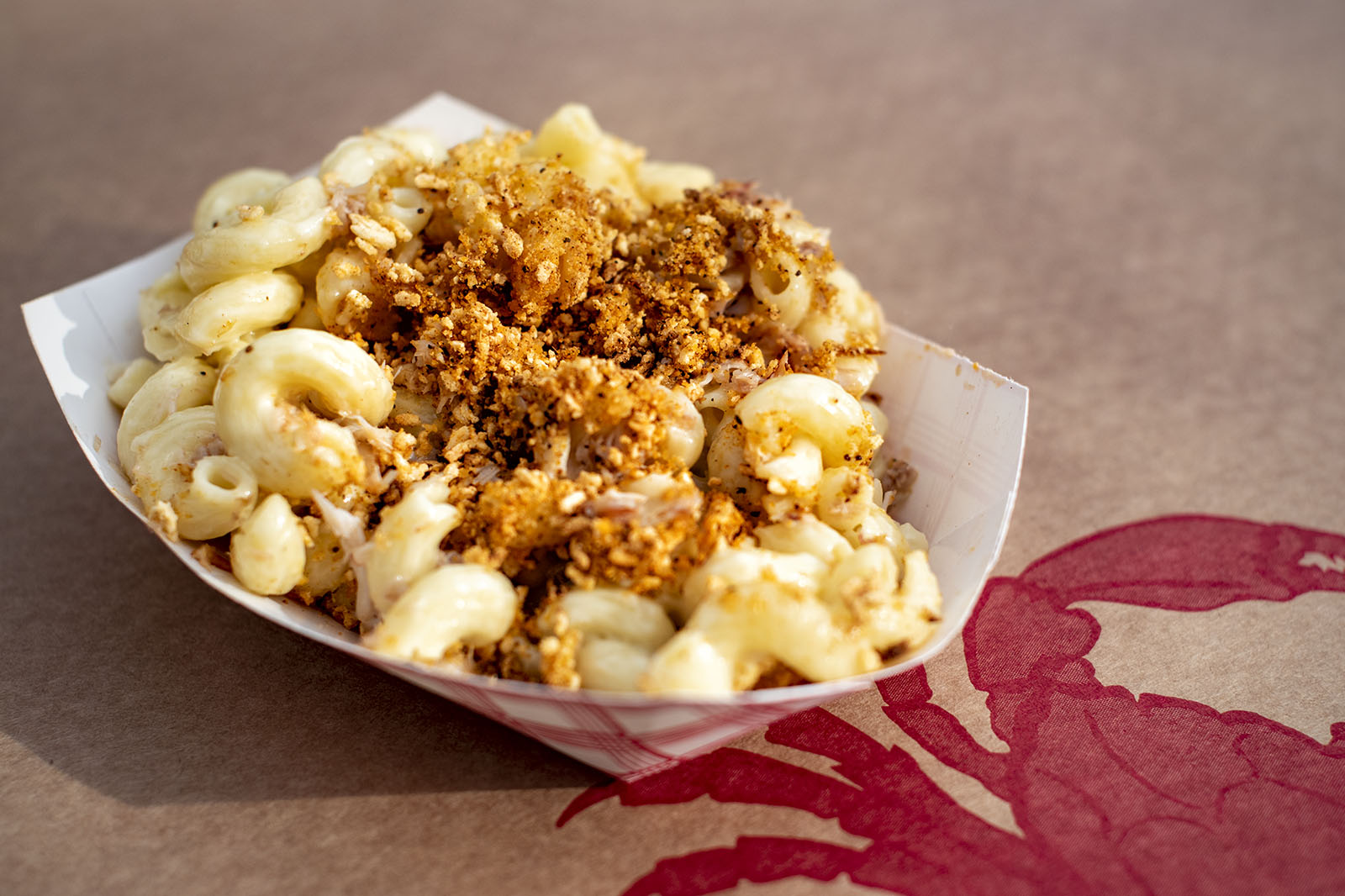 Along with a mallet and knife, the hot crabs arrive piled onto a red plastic tray. Guests can add on chili dust for a spicier flavor. Veteran crab pickers know this isn’t a clean endeavor; Wet Wipes, paper towel rolls, and big silver buckets are handy to help clean up the ensuing mess.