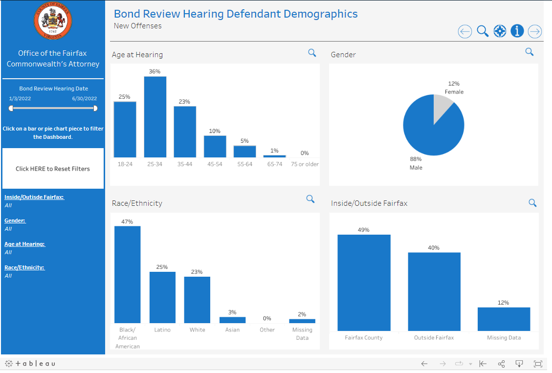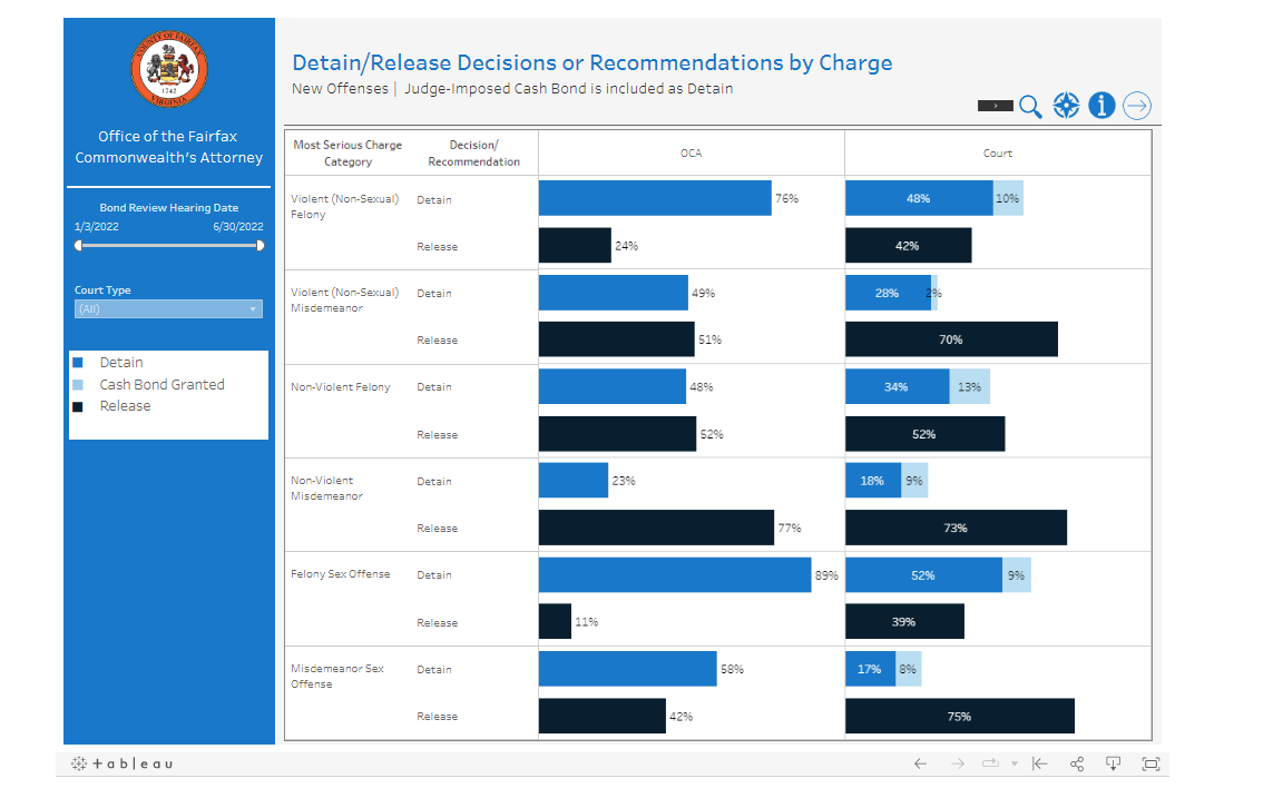 Fairfax’s new dashboard also includes a breakdown of the potential reasons why a prosecutor may recommend detainment. For example, in instances of violent felonies where the court ordered release and the prosecutor recommended a hold, the prosecutor’s reasoning was “danger to family or or household members,” 37% of the time.