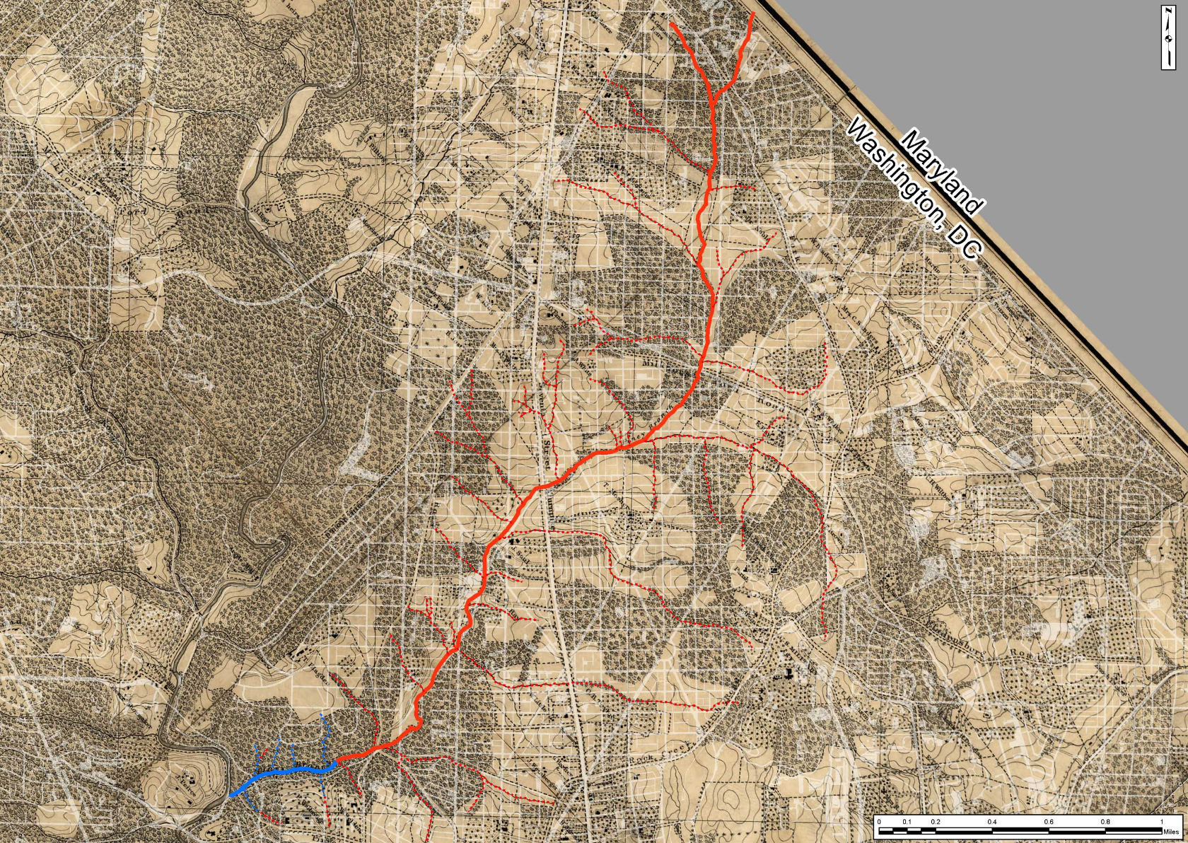 The twisting, rocky stream is a tiny fragment of what it once was. The modern-day Piney Branch runs from near 16th St. NW down to Rock Creek, only about a half mile. Historically, before the construction of neighborhoods like 16th St. Heights, Petworth, and Brightwood Park, the creek drained a large section of D.C., running more than three miles up to the Maryland border near the Takoma Park Metro Station.