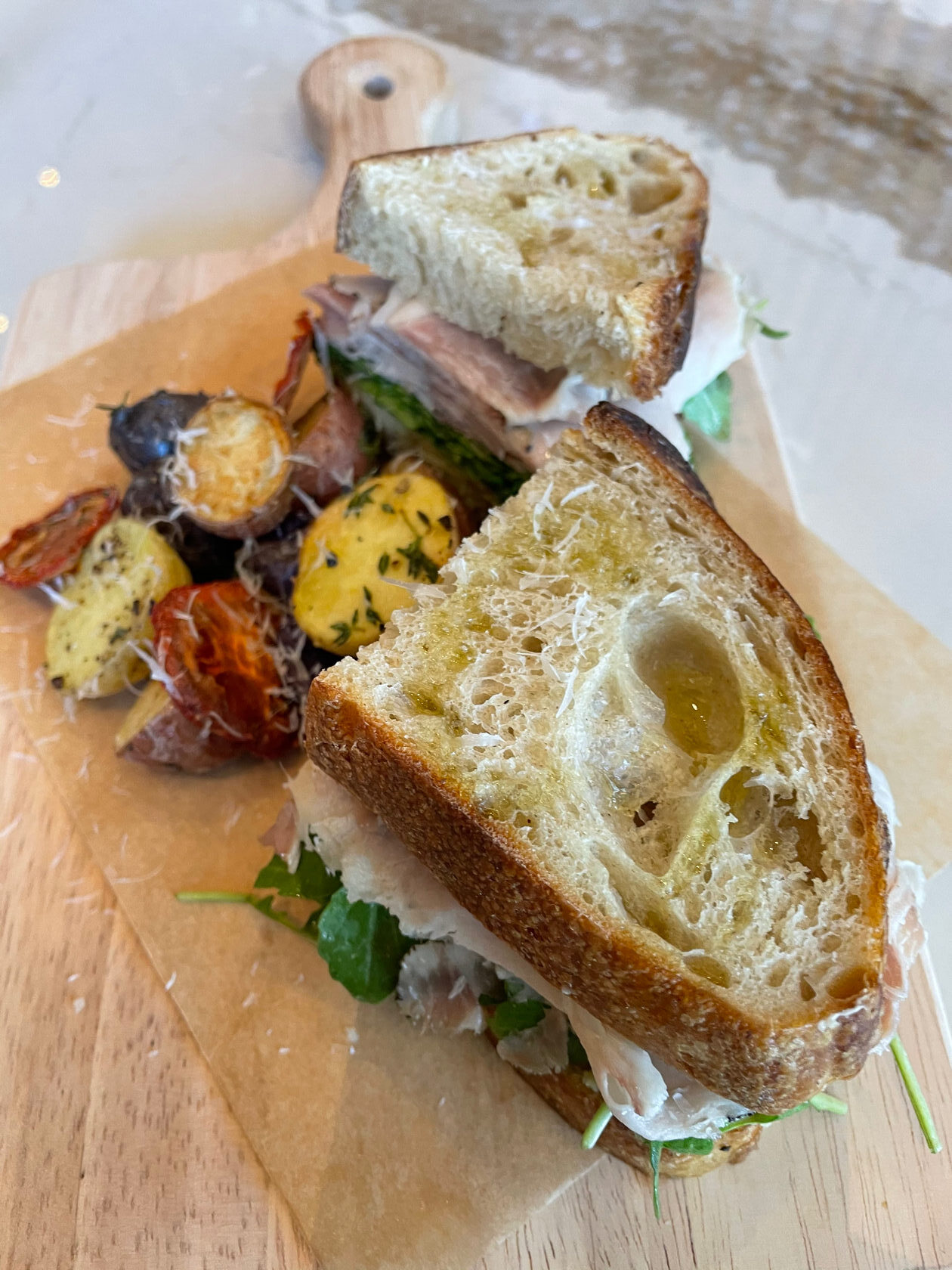 Then there’s the panini porchetta, a sandwich stuffed with garlic confit, arugula, roasted potatoes, and pork that Venini butchers himself. As part of the process, he debones a 25–30-pound suckling pig and stuffs it with cured pork belly.