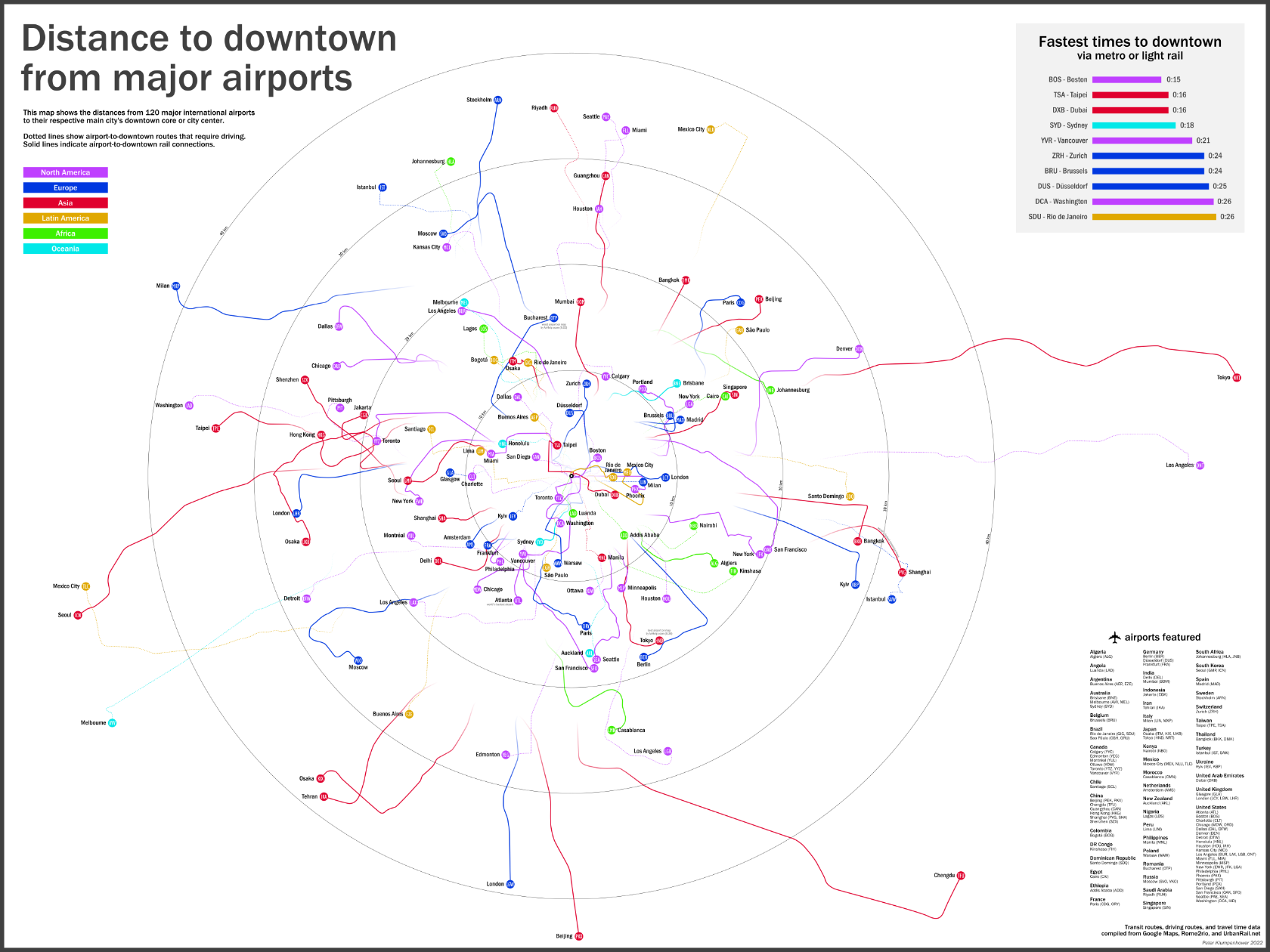 But Dulles is NOT the farthest airport from a city center by rail or bus. Map maker Peter Klumpenhower created a diagram showing the distances between major airports and their urban cores, and as you can see, Tokyo, Japan, Seoul, South Korea, Milan, Italy, Chengdu, China, and Beijing, China all have trains that go farther distances than Dulles.