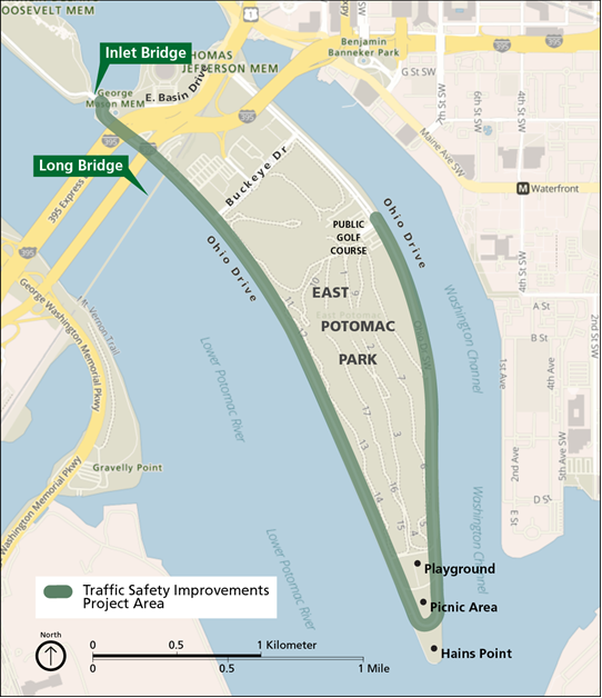 The redesign will also include some new twists as well. Parallel parking will replace the angled parking on Ohio Drive. Bus traffic, including motorcoaches and school buses, will be prohibited on Ohio Drive past the East Potomac Golf Course. The intersection of East Basin Drive and Ohio Drive at Inlet Bridge will become a three-way stop with a left-turn pocket added for eastbound bicyclists on Ohio Drive to the George Mason Memorial, connecting to the 15th Street cycle track and Mount Vernon Trail.