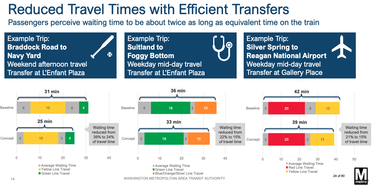For instance, a trip from Braddock Road in Virginia’s Blue and Yellow Line to Navy Yard on the Green Line for a baseball game takes about 31 minutes now. The average wait to catch a train at Braddock takes about six minutes, followed by a 15-minute ride on the Yellow Line, then a six-minute wait at L’Enfant Plaza followed by a four-minute ride.