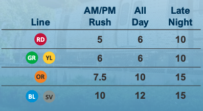 And while riders wouldn’t pay peak fares under this proposal, peak-level service would remain. Here are the train frequencies Metro is aiming for in the budget year starting next July.