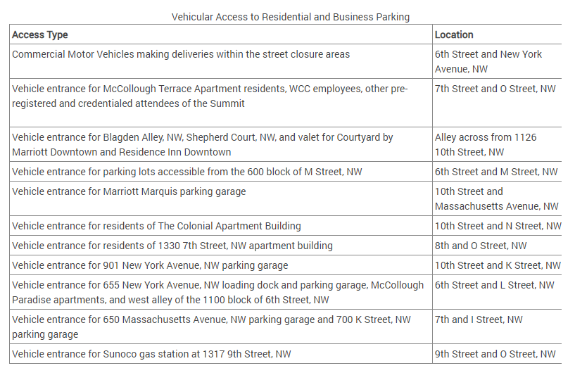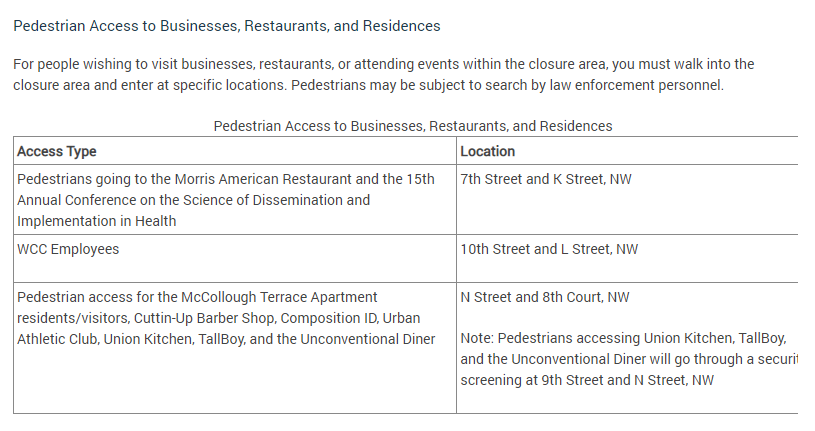 Drivers and pedestrians entering the closures area near the convention center might be subject to a security sweep, per D.C. police. People entering the security perimeter in cars or on foot will be asked to enter the area through specific checkpoints corresponding to their destination. See below for the full list.