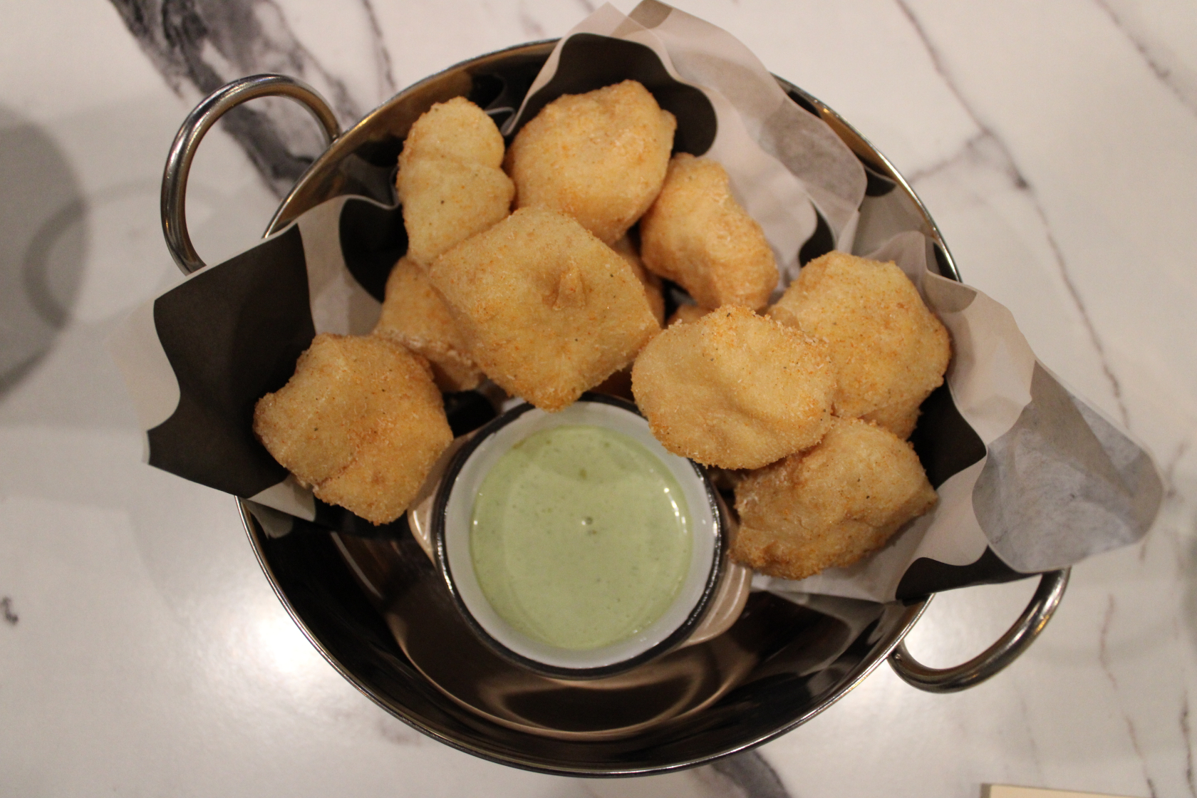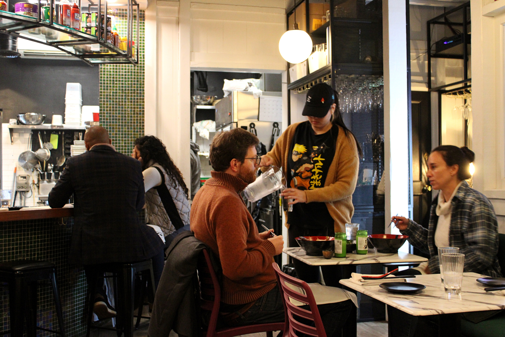 The casual nature of the restaurant is also reinforced by the size and layout of the dining room. The cement walls, white marble table tops, and green-tiled bar are part of the minimalistic design, which has a few small exceptions: a print of the Spiderman pointing meme sits on top of the wine fridge and a curtain covered in birds helps block the dining room from the cold coming in through the entrance.