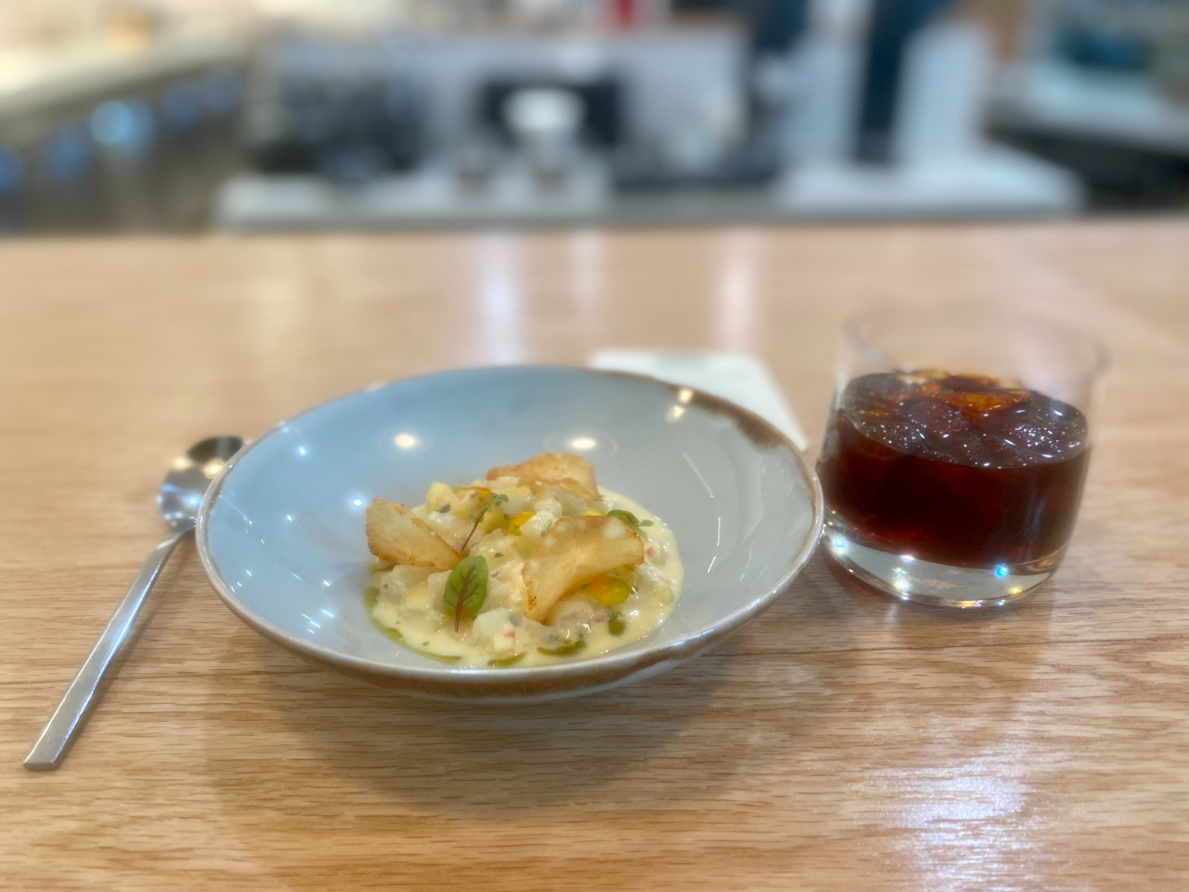 A member of the Café Unido team will walk patrons through the omakase menu to highlight the differences in how each farmer treats their coffee cherries. One course includes two cups of coffee of the same varietal, but from different farms prepared through different processes. (One smells closer to wine than coffee.) The cups of coffee are prepared at the counter and paired with a carimañola, a traditional Panamanian ground-beef fritter, prepared by Chef Jovana Urriola. The accompanying house-made ketchup is even made with the coffee husk. (DCist was gifted the omakase menu during the reporting of this story.)