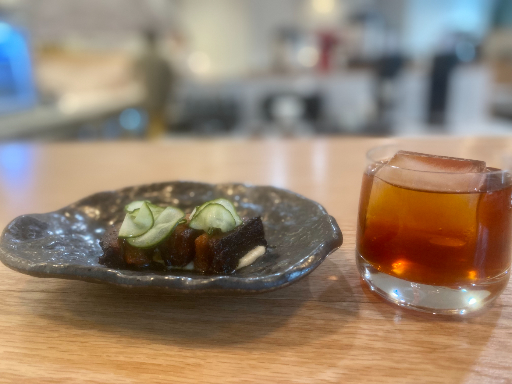 The omakase menu also includes a cold brew with a vegan ceviche and, the crowning jewel, a coffee-based old fashioned cocktail and chicharrón. The rum they use is from a local distillery, Cotton & Reed; Flores says they hope to feature more local companies at the location. Urriola cooked the chicharrón, or pork belly, in the oven for four to six hours, and used coffee husk and various spices. If patrons aren’t ready to leave after their omakase, Unido also offers a menu of natural wines, says Flores.