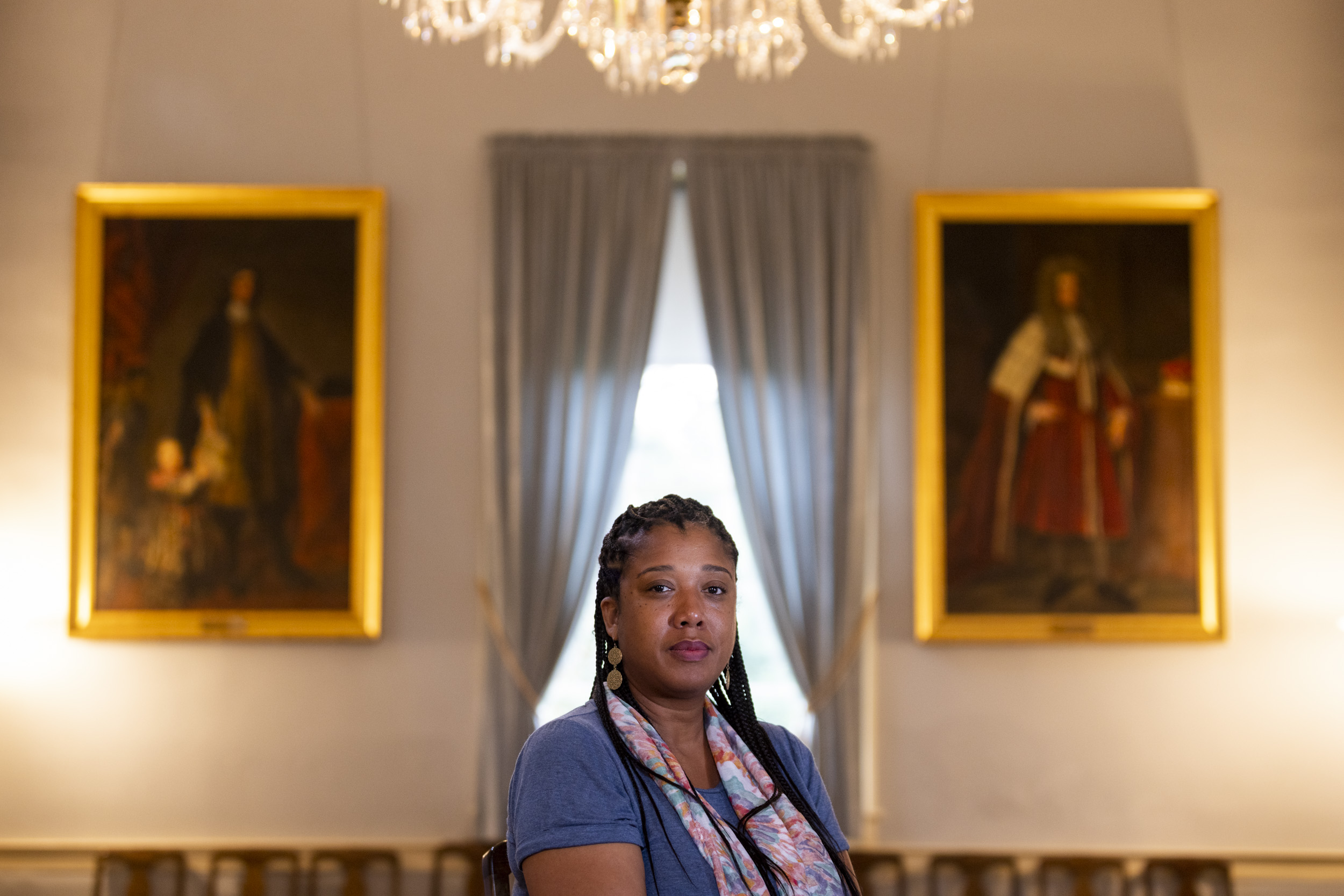 Executive director Maya Davis poses for a portrait in the Riversdale House Museum in Riverdale Park, Md. In the background are reproductions of paintings of Calvert family members who owned and lived in the house. Davis and her staff are trying to introduce more of the history and stories of enslaved people who lived at the house, as well as trace their genealogy. DCist/WAMU toured the museum with Davis for an in-depth look.