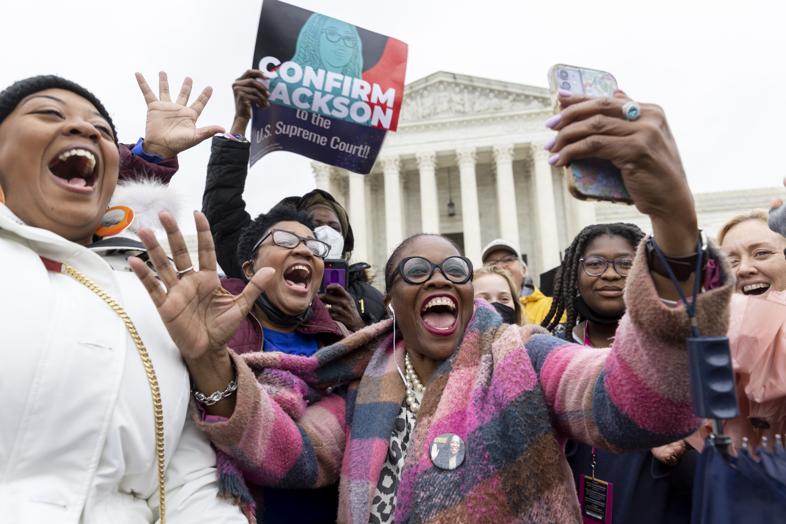 Joy was the word of the day as Regina Langley, middle, of New Jersey, celebrated with friends on the steps of the Supreme Court after the full U.S. Senate confirmed Justice Ketanji Brown Jackson on April 7. Brown Jackson, who previously served on the U.S. Court of Appeals for the D.C. Circuit, became this year the first Black woman confirmed to a Supreme Court Justice seat. DCist/WAMU stories looked at Brown Jackson’s background, the nomination hearings and the celebrations on the Supreme Court steps after the historic vote.