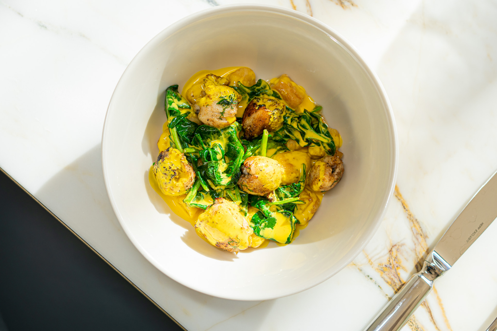 Stefanelli scooped chef de cuisine, Nico Cezar, from Masseria. Together, Cezar and Stefanelli create more modern approaches to some of the classics: for example, fanciful dishes kick off the meal, including fois gras paired with huckleberry gastrique over pliable brioche, and a single garlic-butter-drenched escargot nestled in puff pastry ($21). Another French classic, frog legs ($22), sits in a saffron sauce alongside Parisian gnocchi, in which wheat flour subs in for potato.