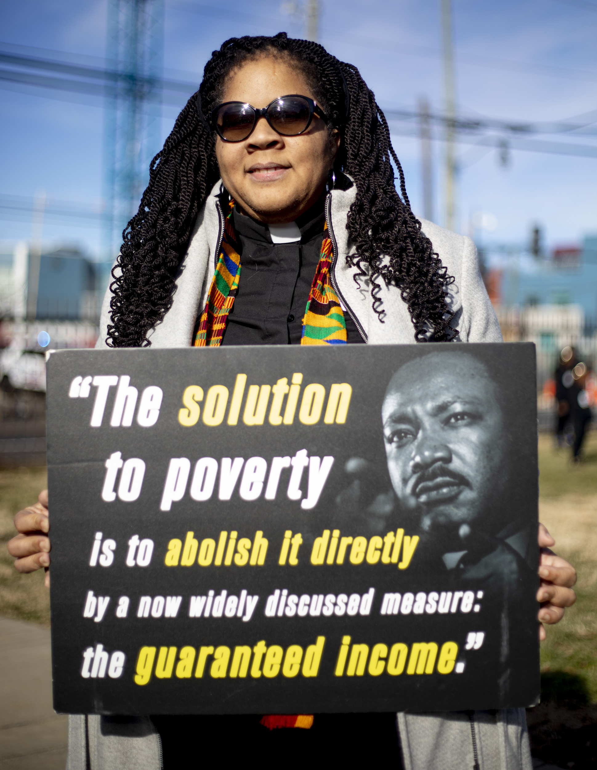 Rev. Wendy Hamilton attended, carrying a sign about universal basic income, which was at the center of her campaign last year to replace Elanor Holmes Norton as D.C.’s delegate to Congress. King was an early proponent of direct cash assistance and Hamilton hoped to remind people that he championed the policy — indeed, guaranteed income had been the topic of his final book.