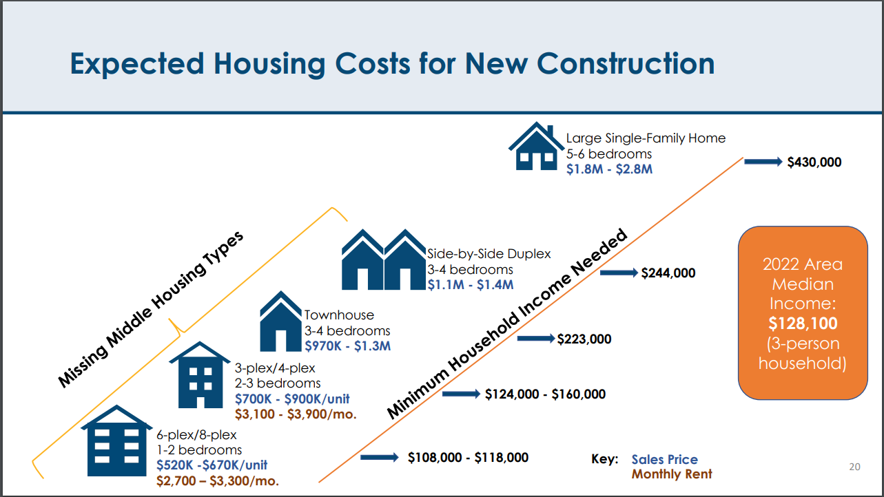 For example, a newly-developed missing middle unit with 2-3 bedrooms in a triplex or 4-plex could run between $700,000 – $900,000, according to county estimates from May 2022. At the time, the county suggested those units would be affordable to households bringing in $124,000 – $160,000 per year. (Some note that the county’s assessment of affordability assumes a fairly large down payment and were calculated before interest rates jumped up in response to inflation.)