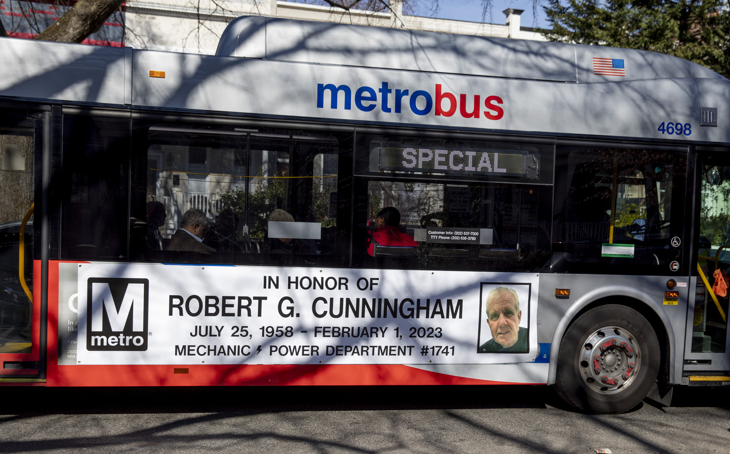 His funeral procession trailed from Saint Camillus Catholic Church in Silver Spring to the Congressional Cemetery where nearly 200 people gathered graveside, included a stop at the Metro station. The procession included police officers on motorcycles leading the way and three Metro buses with Cunningham’s face on the side.