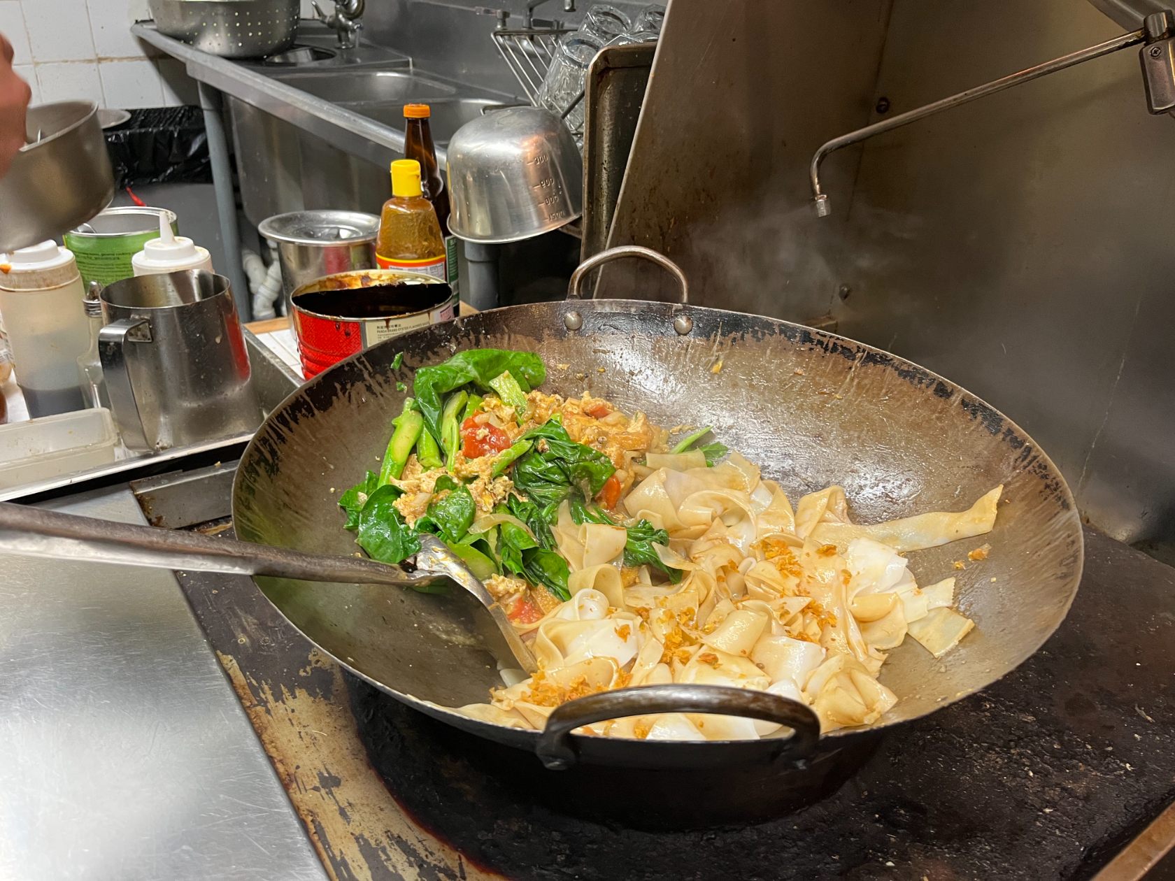 It’s clear that every one of the dishes here are a reflection of Vigsittaboot’s culinary skill, passion, and cultural heritage — but also his physical effort. A peek behind the thin curtain of beads reveals a no-fuss kitchen, with only two four-burner stoves side-by-side. “One’s for cooking and one’s for deep-frying,” Vigsittaboot says. Pots and pans hang from a simple metal rack on the ceiling. “I have an assistant to help me, but otherwise it’s a one-man operation.”