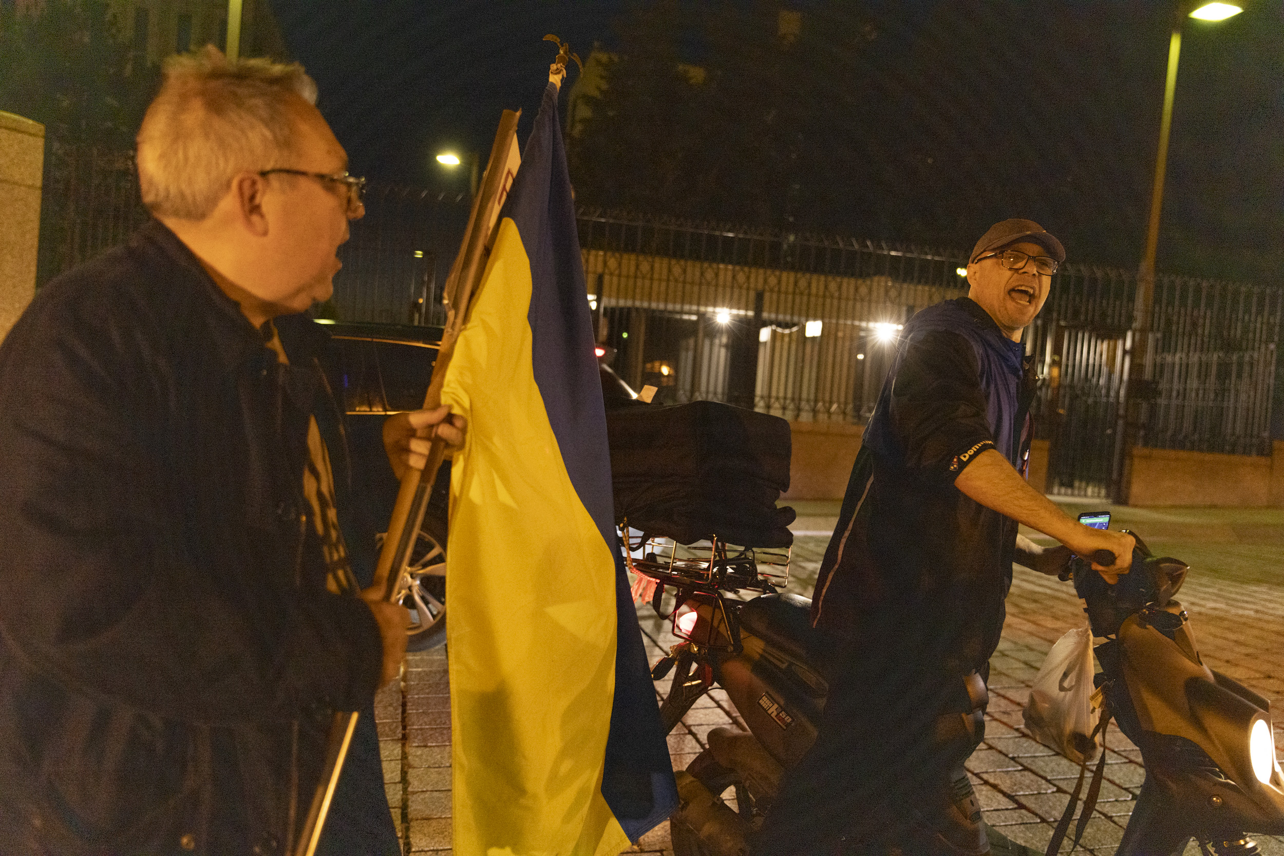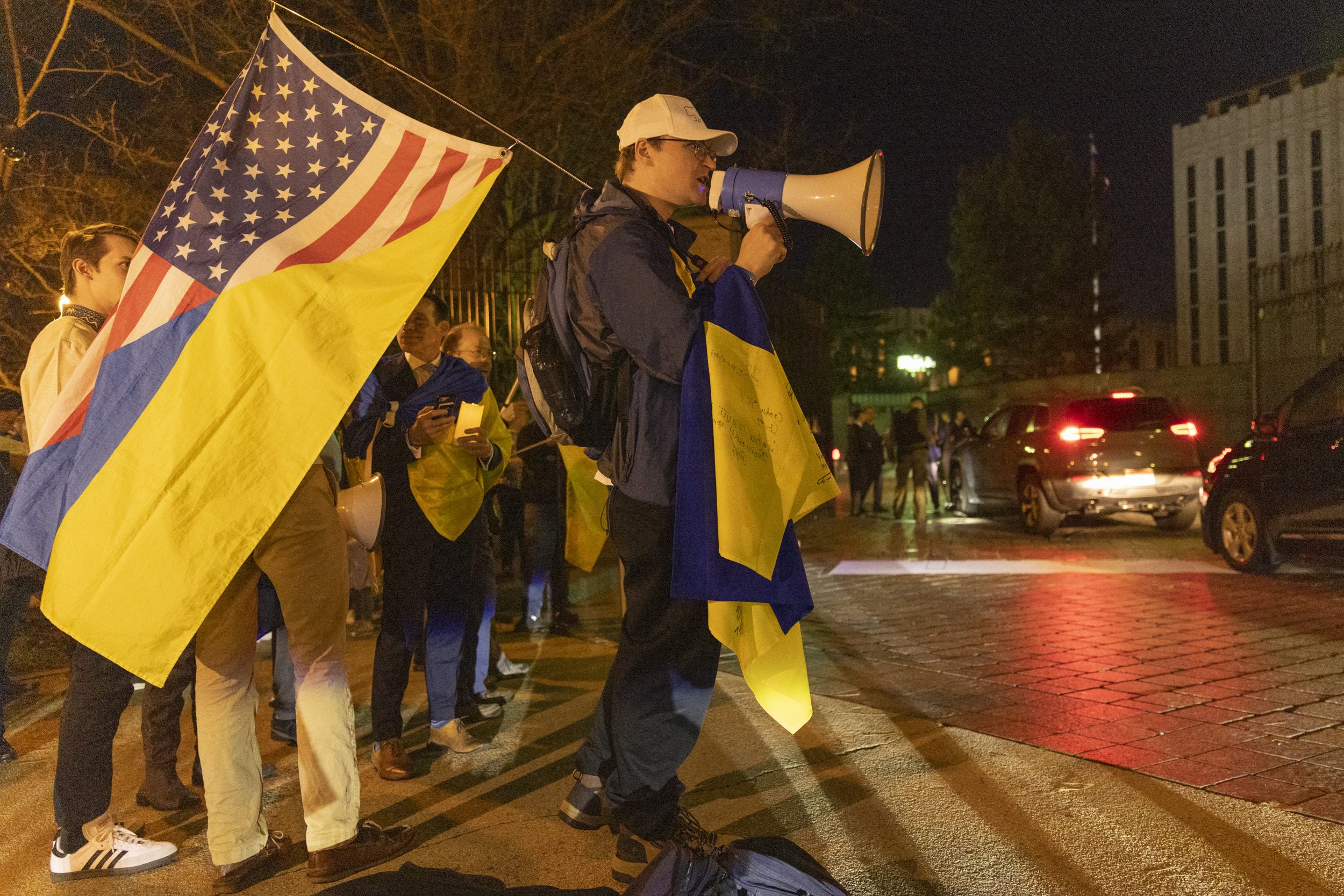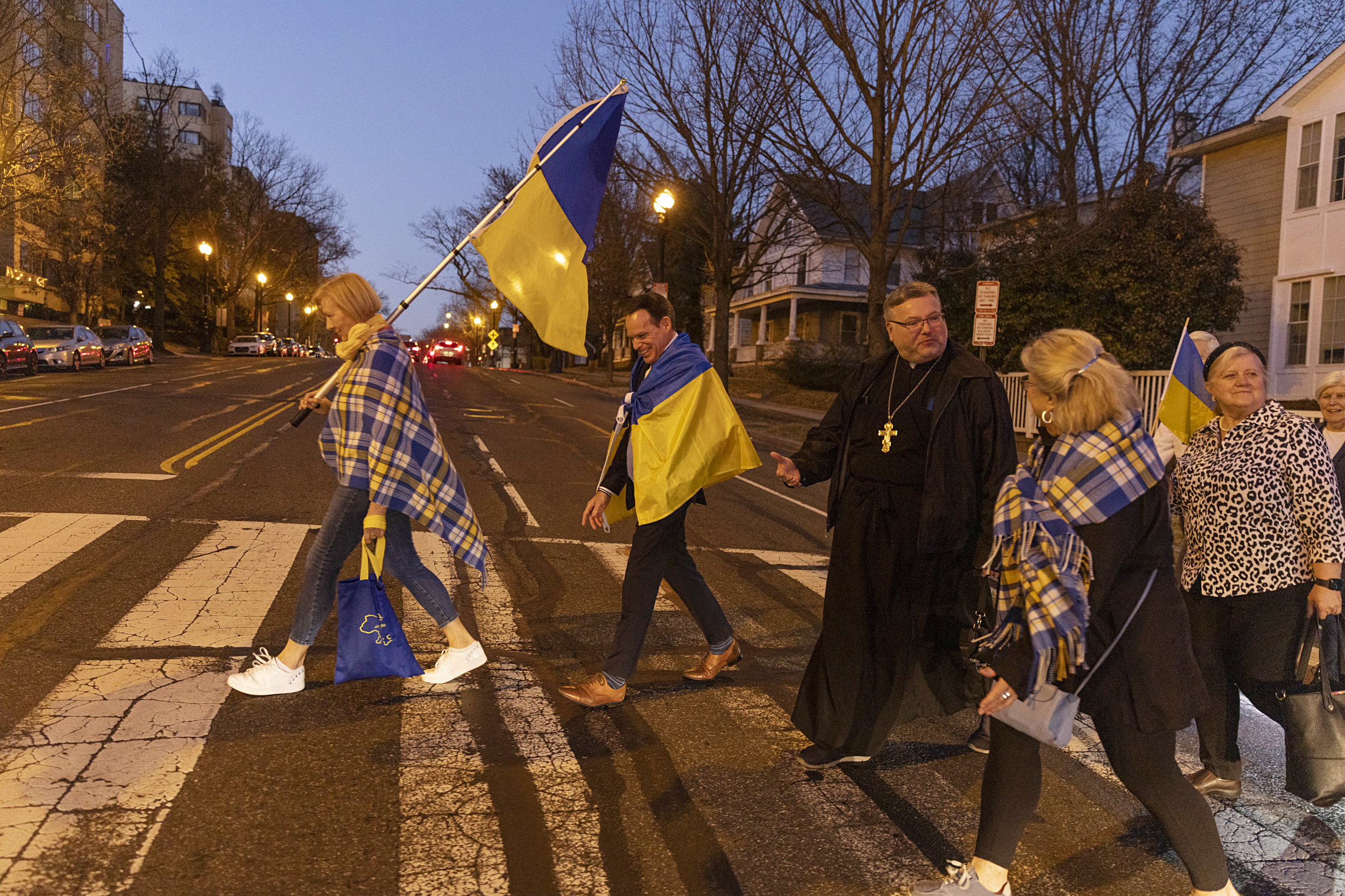 Samokish is far from the only Ukrainian American who feels obligated to speak out and take action. On this anniversary of the war, Ukrainians throughout the D.C. region are marking the date solemnly. Michael Sawkiw, the executive vice president of the Ukrainian Congress Committee of America, stood outside of the Russian Embassy on Thursday evening with about two dozen others to demand the world bear witness to the war in Ukraine.
