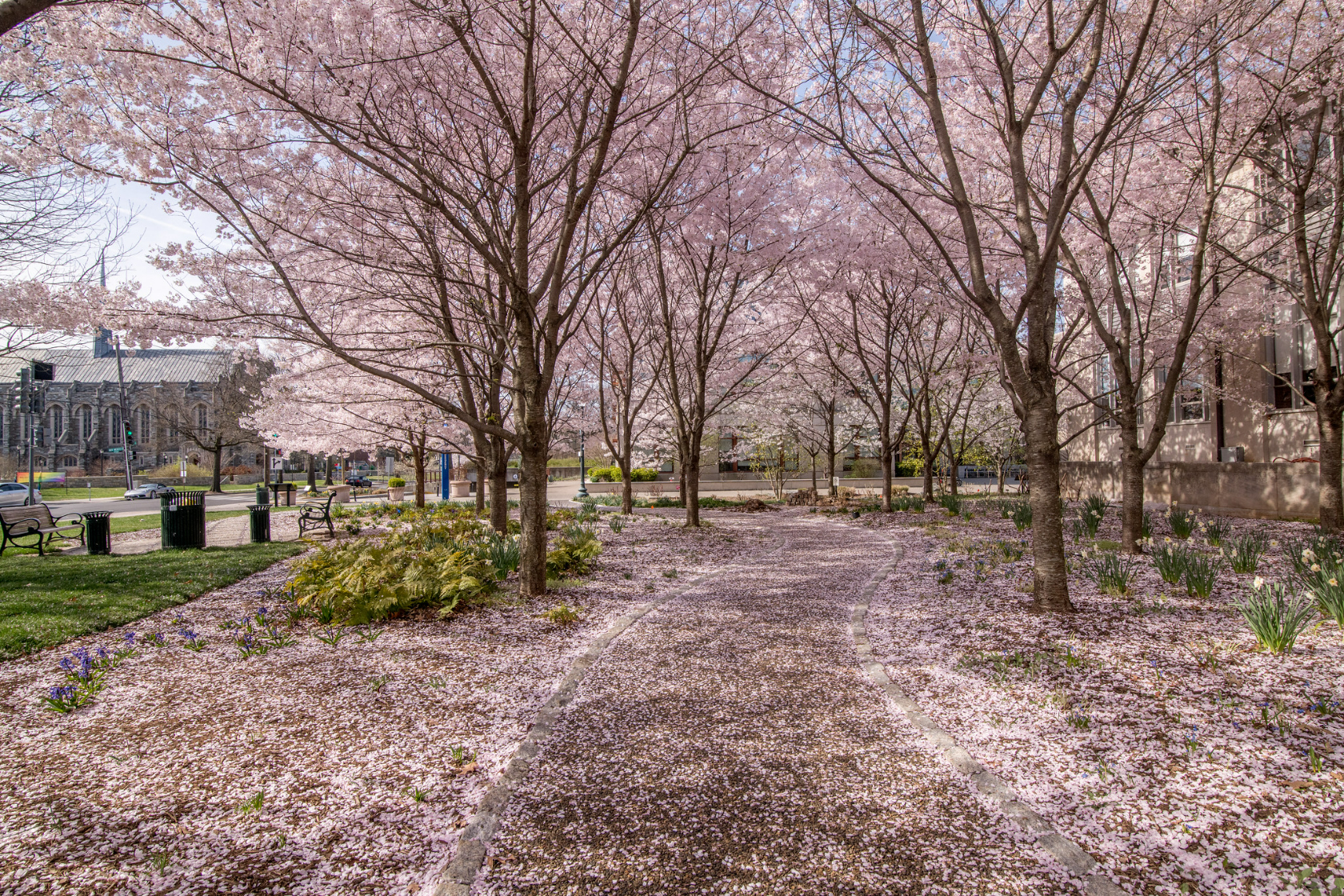 HILL BLOSSOMS: Stanton Park on Capitol Hill is a popular neighborhood for many reasons, including its namesake park with blossoming trees surrounding the central statue of General Nathanael Greene. (4th Street NE)