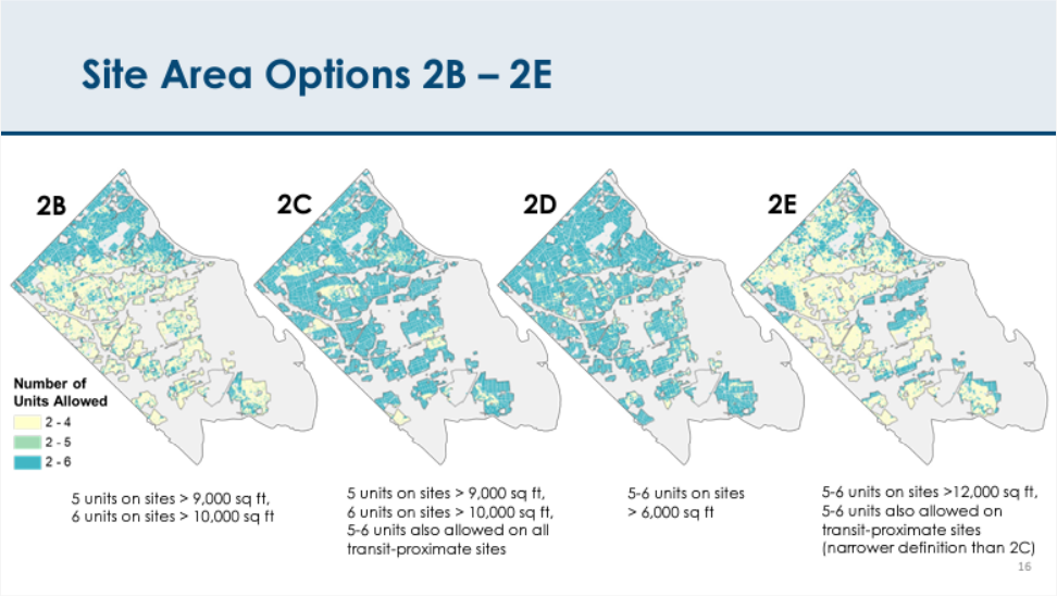One of the key areas of compromise was “minimum site area,” a zoning term meaning the number of units allowed on a site of a particular size. The most unrestricted option would have allowed up to six units on all residential lots in the county, effectively relying on other restrictions in the zoning code to prevent overly large buildings on smaller lots. But after robust debate, the board chose an option that will allow 5- and 6-unit buildings only on lots above 6,000 square feet (and in some special cases, above 7,000 square feet).