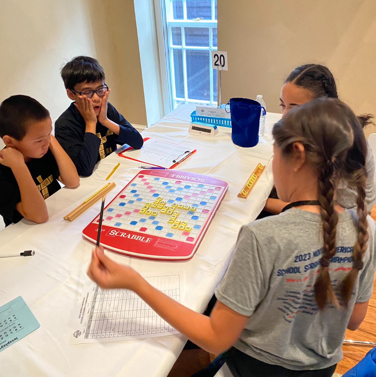 The tournament pits elementary, middle, and high school students from across the continent against one another in a series of Scrabble games, all lasting 50 minutes. The younger students are paired up on teams of two while the high school students play each game individually.