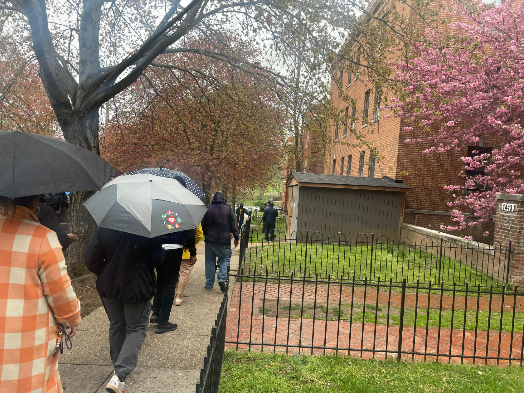 11:05 a.m.: Under dressed and umbrella-less, I arrive at the corner of 14th and Sheridan Streets where a few reporters are gathered with a crew of DC Health officials for the “rodent walk.” As we’re waiting for the Mayor’s camera crew to arrive, I spot what appears to be another group preparing for a different walk one street over. They’re holding a wooden cross and I remember it’s Good Friday — the Christian holiday that marks Jesus’ crucifixion. The lapsed Catholic in me wants to pull out some metaphor comparing Jesus’ walk up Calvary Hill to our 50-foot walk down to witness a rat decimation, but I lack the creativity.
