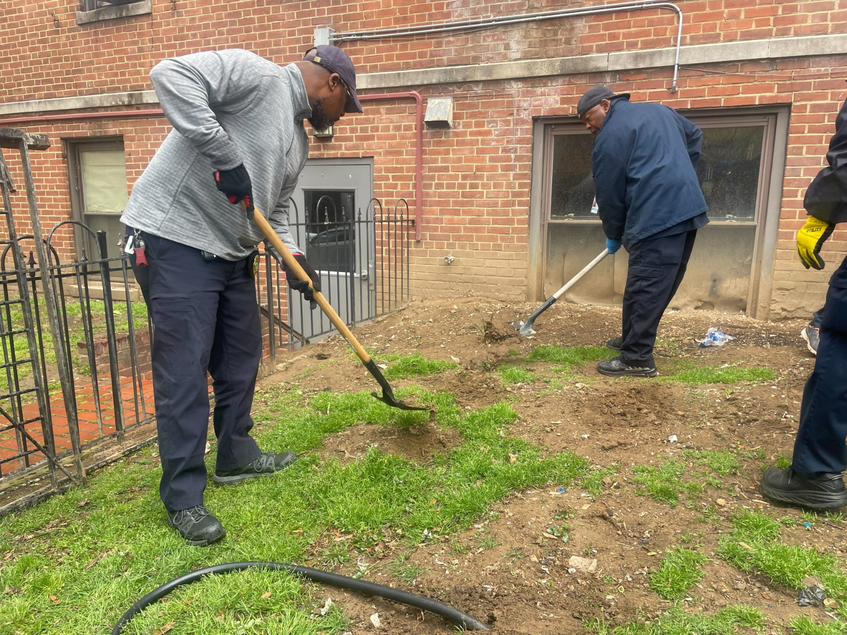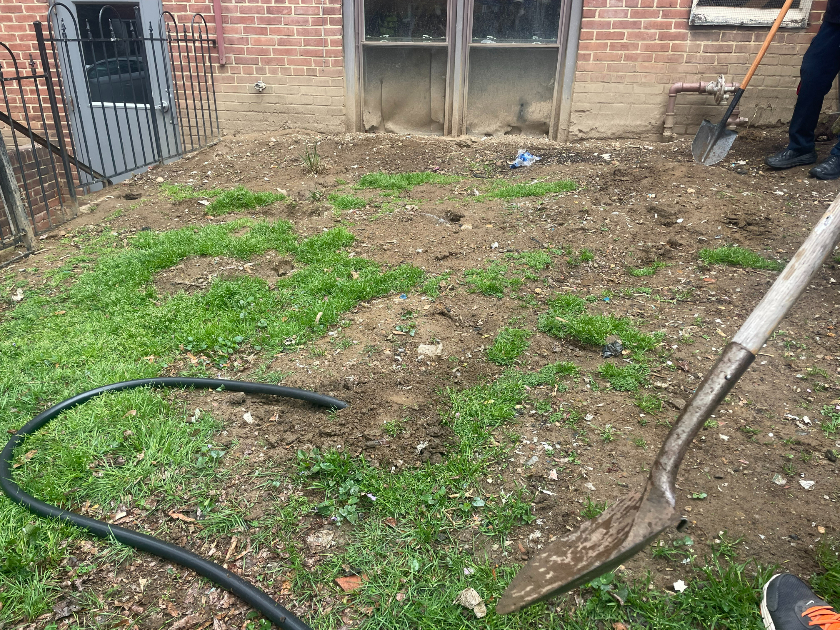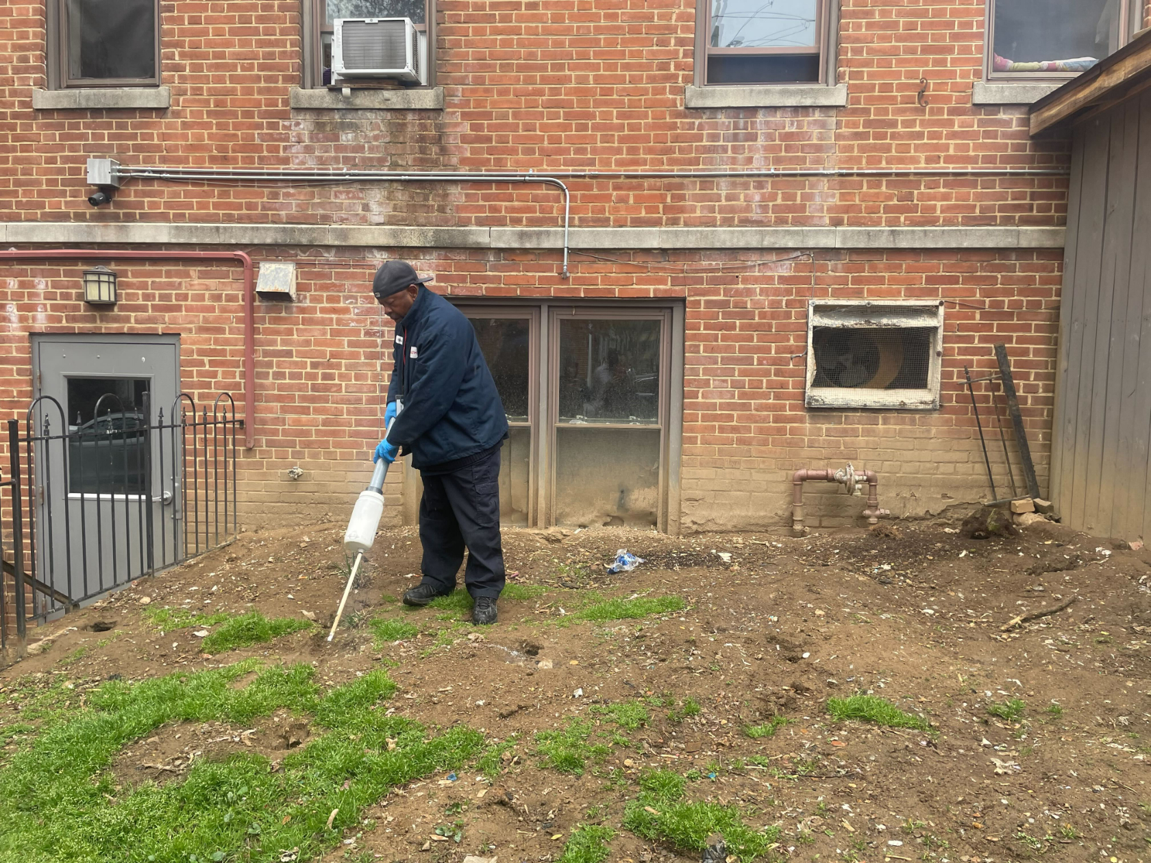 11:07 a.m.: The mayor’s crew arrives moments later. Gerard Brown, the program manager for DC Health’s Rodent and Vector Control Division, introduces himself and tells the group we’ll be walking down the block to a “heavy infestation,” where we will see how the crews treat the rat burrows. (A generous DC Health employee hands me their umbrella.) We begin our one-minute trek.