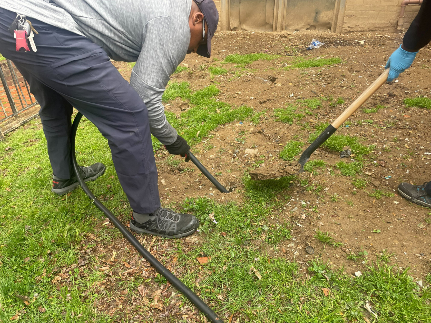 11:11 a.m. This is where things began to get a little hairy. While they move the tube from hole to hole, additional crew members go in with shovels to clog the remaining burrows, attempting to block exit paths for any rats in the burrows.