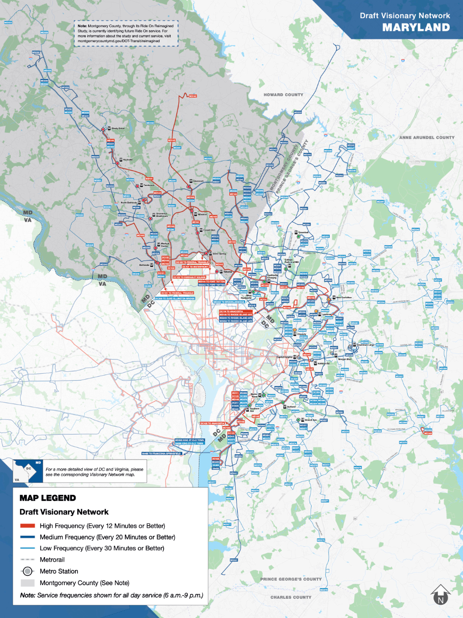 You can also view individual route proposals, which have been temporarily renamed with a state abbreviation and three-digit number, like DC100, for easier discussion during the redesign process. Metro is not yet proposing which lines should be “express/limited stop” service, nor is it proposing exact bus stop locations at this time.